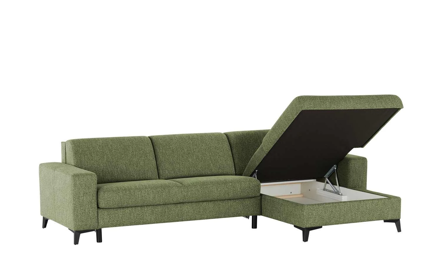 Schlicht und zeitlos präsentiert sich das Ecksofa Betty 2.0. Der strapazierfähige Bezug aus Flachgewebe umhüllt das gesamte Sofa: Sie können Betty 2.0 daher frei im Raum platzieren. Schwarze Metallfüße runden das Erscheinungsbild ab. Erstklassigen Sitz- und Liegekomfort bietet das Ecksofa durch seine Kaltschaumpolsterung und den Comfort-Lattenrost. Strecken Sie sich auf der Ottomane aus oder erweitern Sie das Sofa zum Schlafen. Mit nur wenigen Handgriffen wird Betty zur Schlafgelegenheit für Besuch. Die passende Bettwäsche können Sie problemlos im praktischen Bettkasten verstauen.