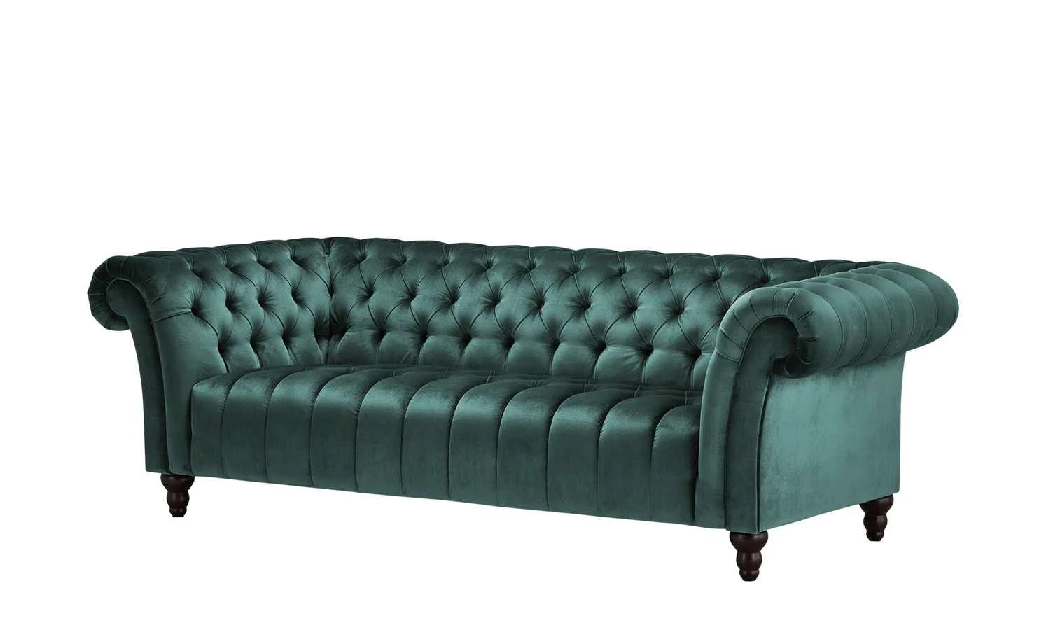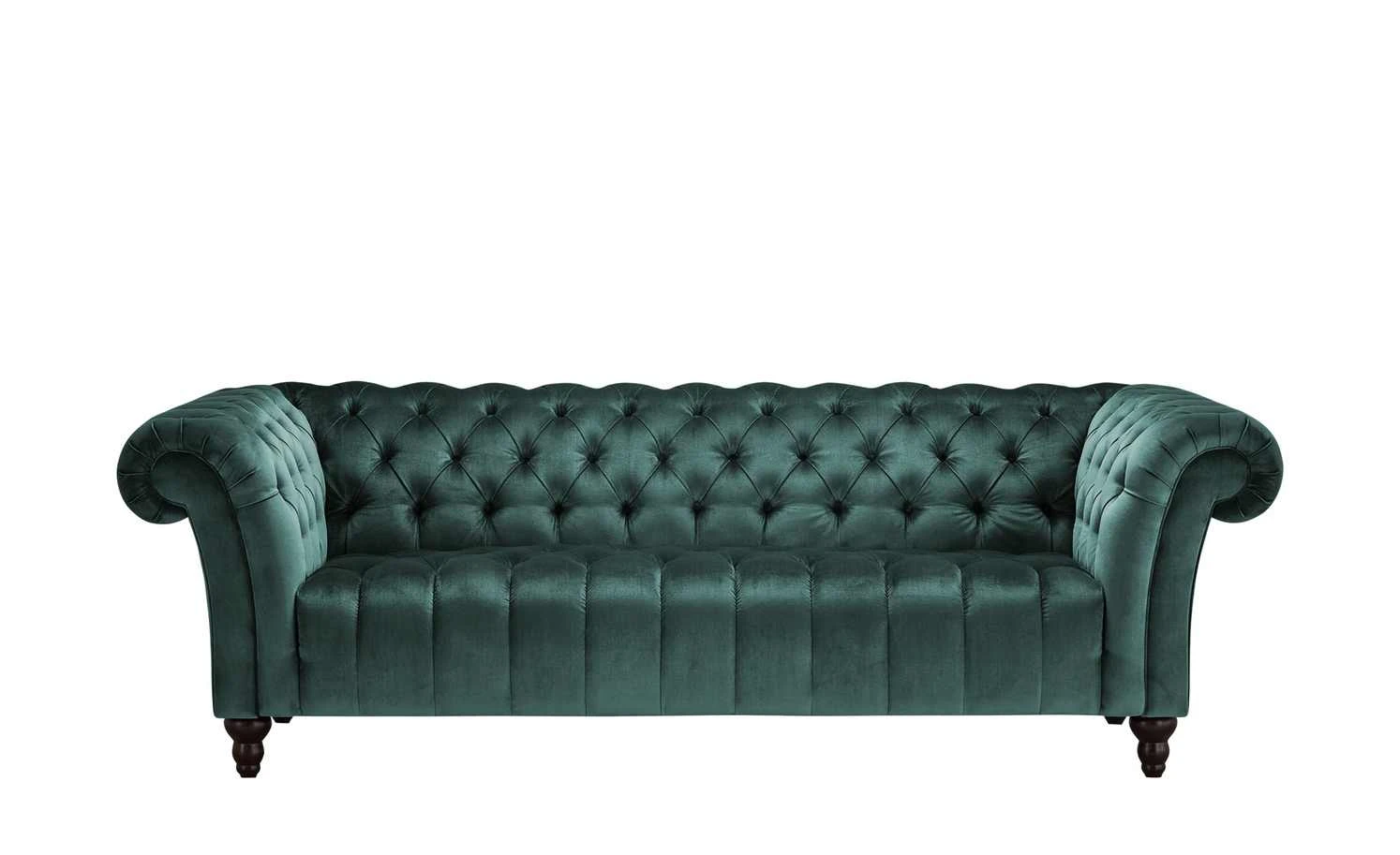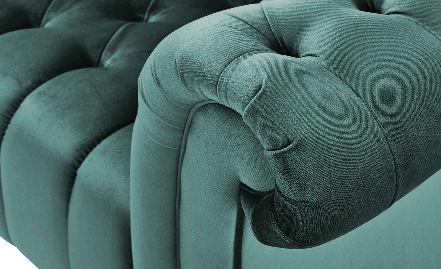 Das Big Sofa Canyon ist ein Eyecatcher im Vintage-Design. Es fällt durch seine vielen schönen Details auf. Die geschwungene Formgebung von Rückenlehne und Armlehnen und die Steppungen mit Zierknöpfen erinnern an den klassischen Chesterfield-Stil. Selbst die stabilen Massivholzfüße des Sofas sind dekorativ gearbeitet. Canyon ist mit einem Samtstoff bezogen – einschließlich der gesamten Rückseite. Der Bezug fühlt sich angenehm weich an und hat ein glänzendes Finish. Er bringt die Farbe wunderbar zur Geltung. Neben der Optik punktet das Big Sofa mit einem bequemen Sitzkomfort. Dafür sorgen die dicke Polsterung mit gut abfedernder Wellenunterfederung und die angenehme Sitztiefe.