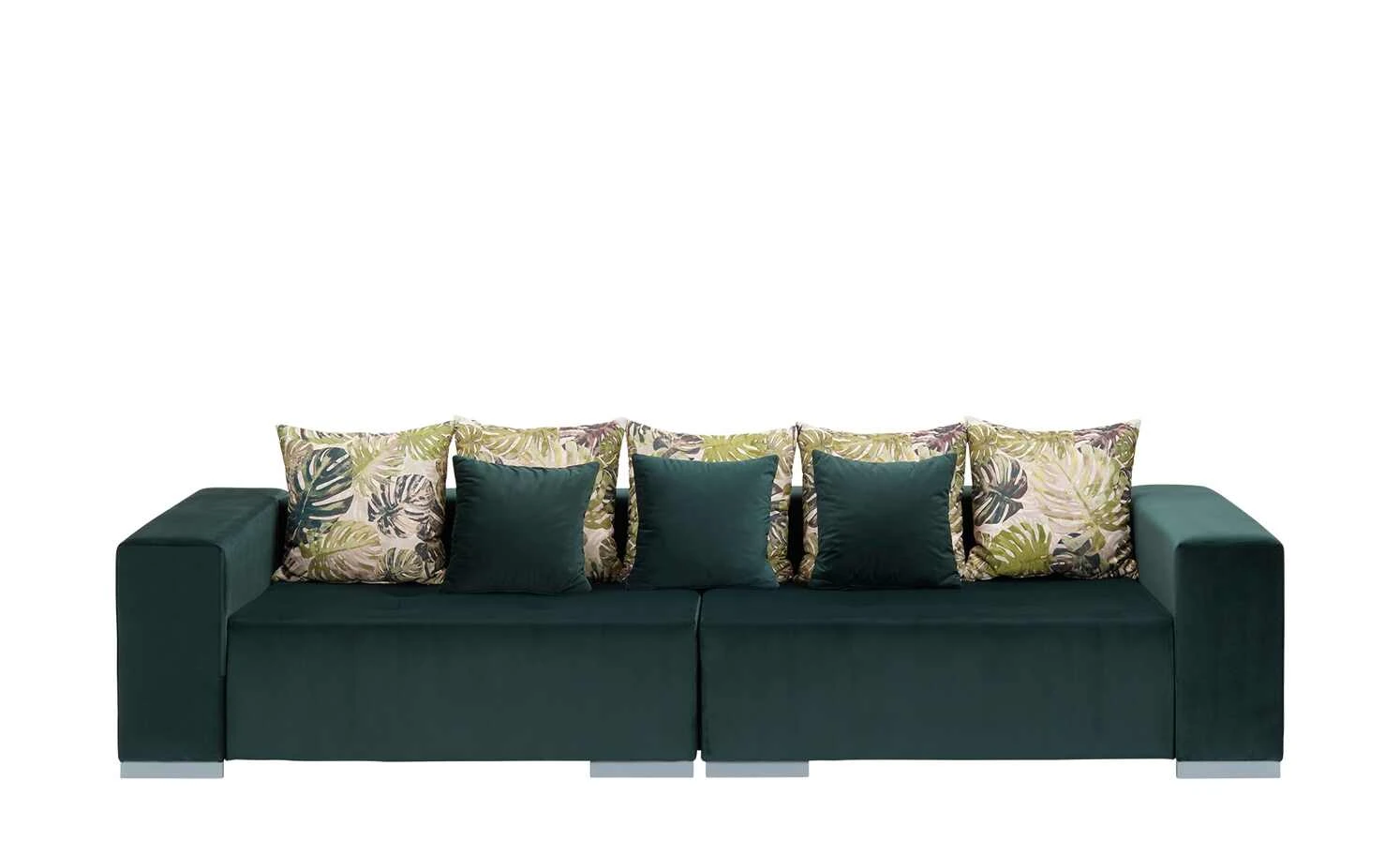 Edel und gemütlich zugleich: Das Big Sofa Maxi in samtig glänzendem Waldgrün. Die hochwertige Schaumstoffpolsterung sorgt für langanhaltenden Sitzkomfort. Der samtige Mikrofaserbezug und die ebenso weichen Kissen erhöhen den Gemütlichkeitsfaktor. Fünf der acht mitgelieferten Zierkissen sind mit einem Palmendruck versehen und verleihen dem Big Sofa Maxi einen edlen Dschungel-Look. Die Massivholzfüße sind dezent gehalten und runden das Gesamterscheinungsbild des Sofas ab. Platzieren Sie das Big Sofa gern auch mittig im Raum: Auch der Rücken der Couch ist mit dem waldgrünen Stoff bezogen.