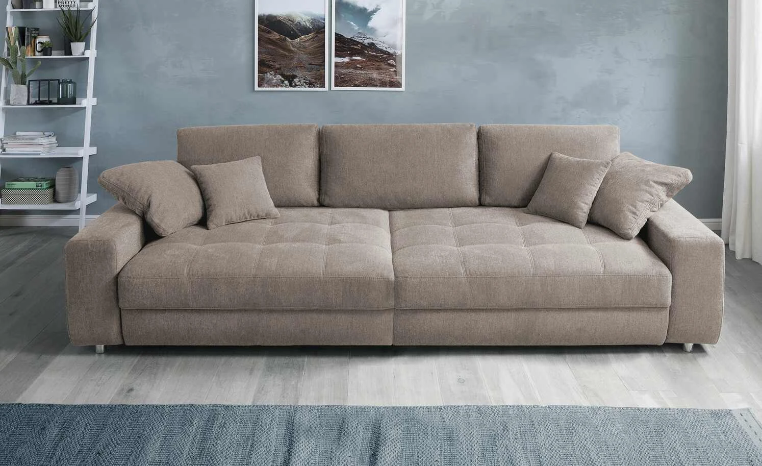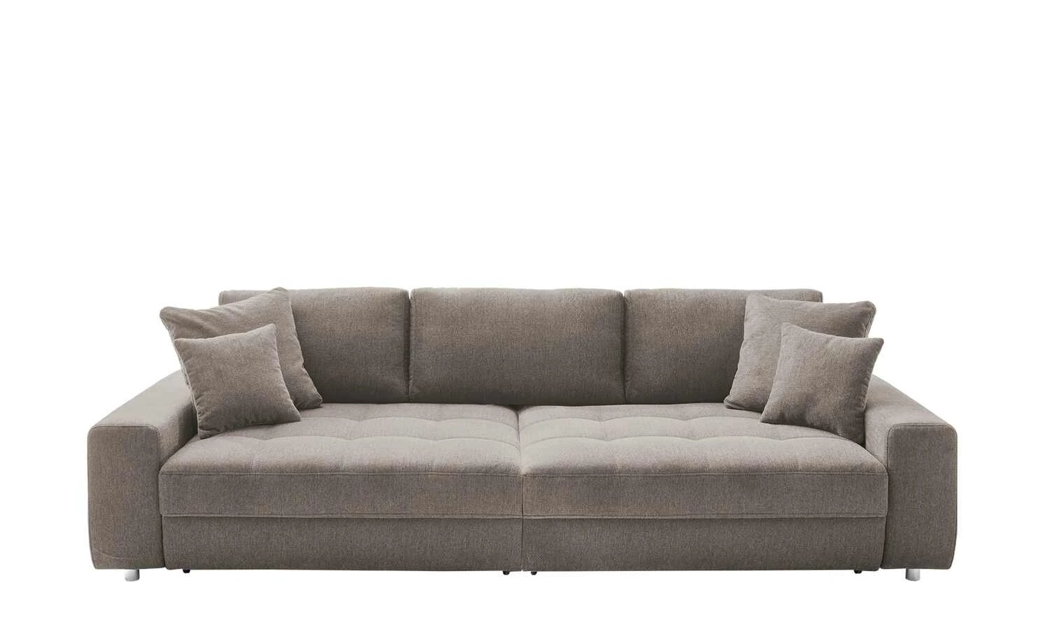 Besonders viel Platz für Freunde und Familie bietet das Big Sofa Arissa de Luxe. Die hochwertige Boxspringpolsterung unter der gesteppten, 81 Zentimeter tiefen Sitzfläche und die Wellenunterfederung sorgen für langanhaltenden, hohen Komfort. Das gesamte Sofa ist mit einem strapazierfähigem Webstoff bezogen, ebenso wie die insgesamt sieben Kissen. Sie können Arissa de Luxe daher problemlos auch mittig im Raum platzieren. Runde Metallfüße in Chrom-Optik veredeln das Erscheinungsbild des Sofas.