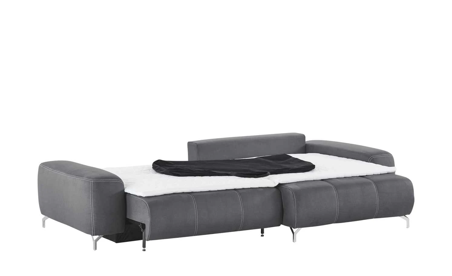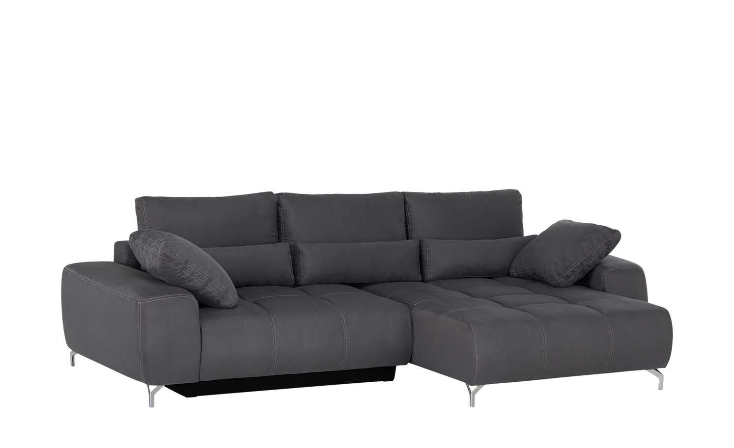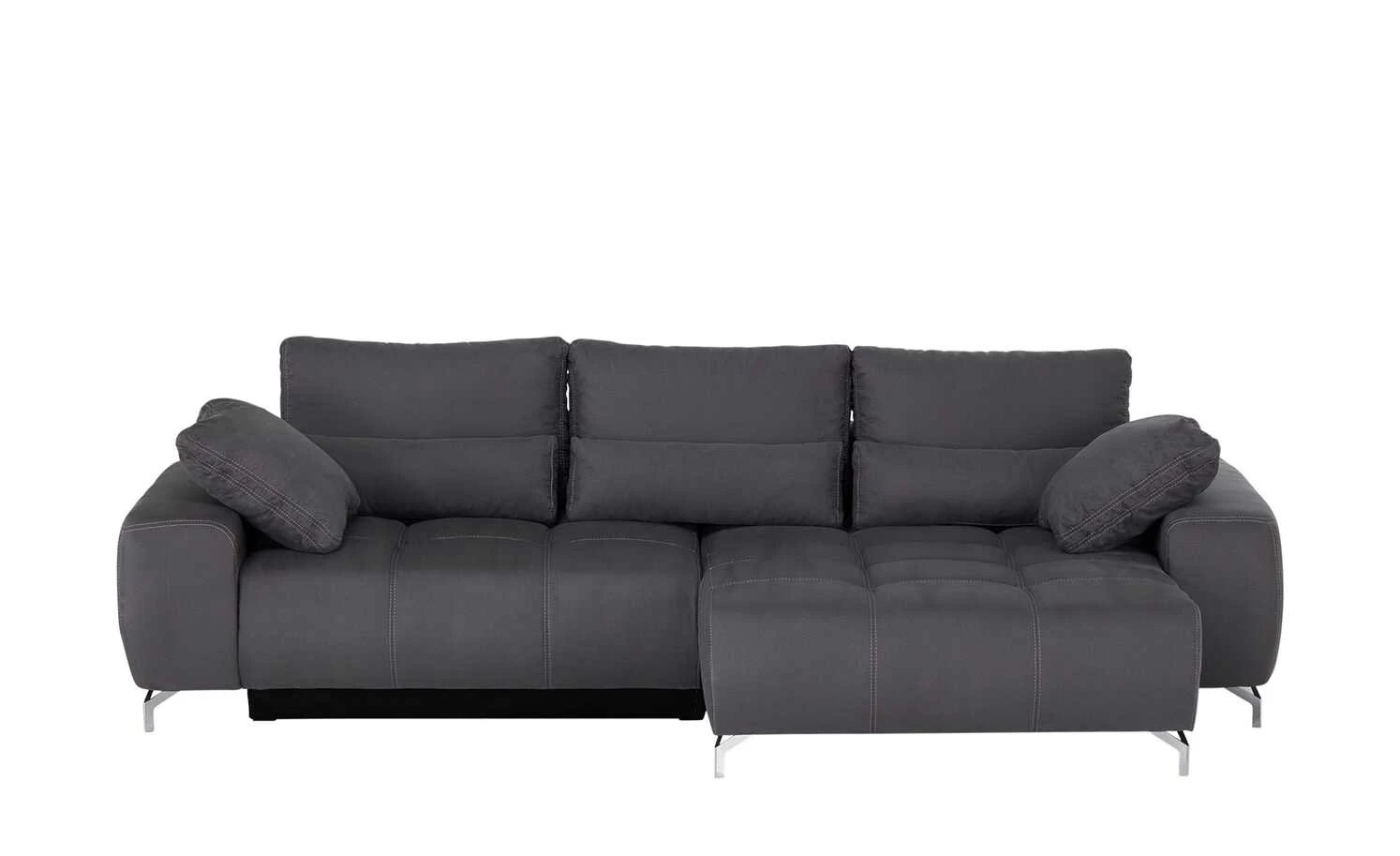 Das Ecksofa Filis de Luxe können Sie gut als Gästebett nutzen. Mit wenigen Handgriffen ist es zum Bett ausgezogen. Für mehr Liegekomfort ist ein weicher Topper im Lieferumfang enthalten. Darüber hinaus hat Filis de Luxe einen Federkern und eine Boxspringpolsterung. Sie können Sie sie auch mittig im Wohnzimmer platzieren. Mehrere weiche Kissen sind im Lieferumfang enthalten. Dazu gehören drei Rücken-, drei Nieren- und zwei Zierkissen. Alle acht greifen den Farbton des Bezuges auf.