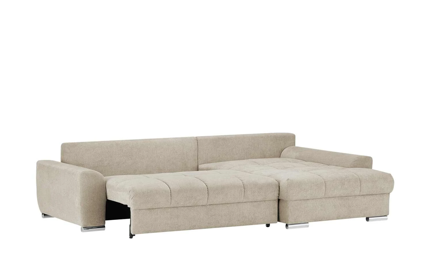Das Ecksofa Soumia fällt durch die quadratische Steppung seiner Sitzfläche sofort ins Auge. Die Schaumstoffpolsterung und die Wellenunterfederung sorgen für langanhaltenden Sitz- und Liegekomfort. Soumia besitzt eine Schlaffunktion und kann mit wenigen Handgriffen zum Gästebett umfunktioniert werden. Die Bettwäsche für den Besuch können Sie im praktischen Bettkasten unter der Sitzfläche verstauen. Das kompakte Sofa in L-Form ist komplett bezogen und kann auch frei im Raum stehen. Die chromfarbigen Füße passen zum edlen und modernen Erscheinungsbild von Soumia.