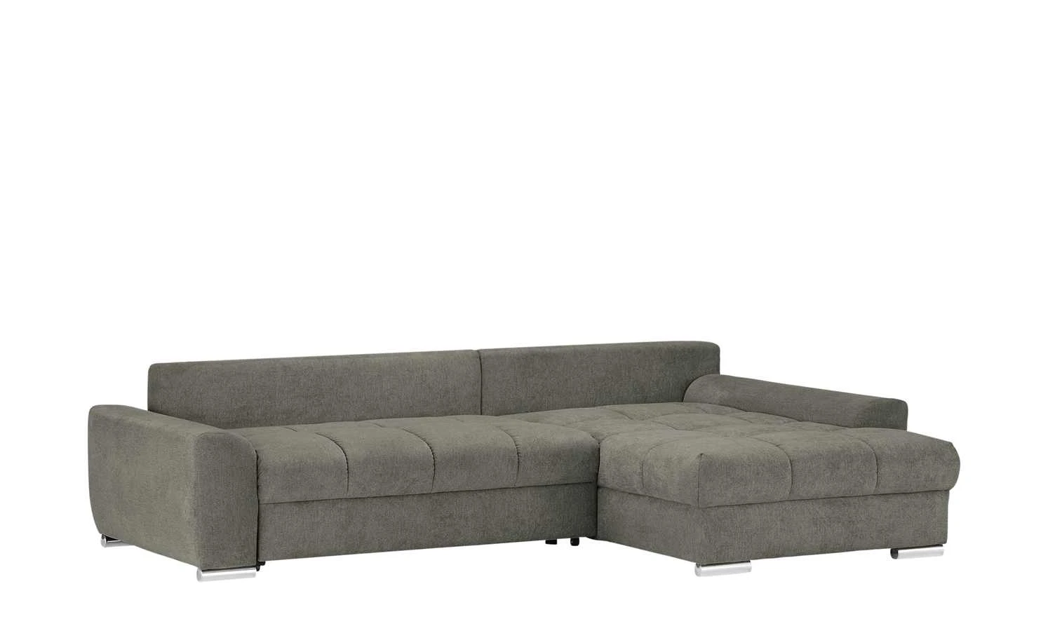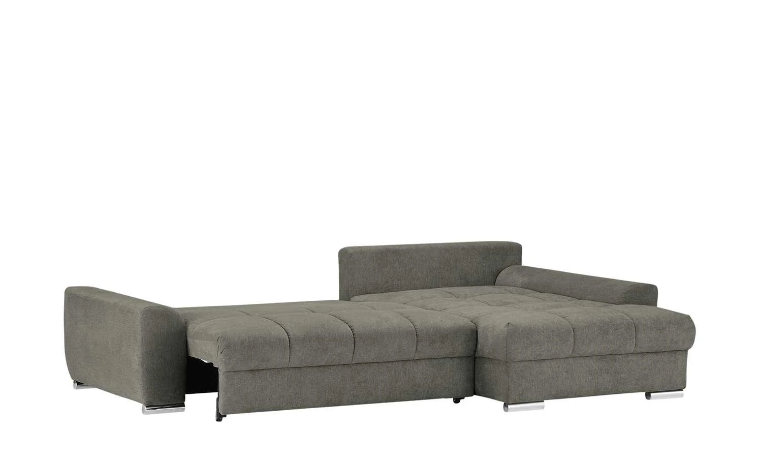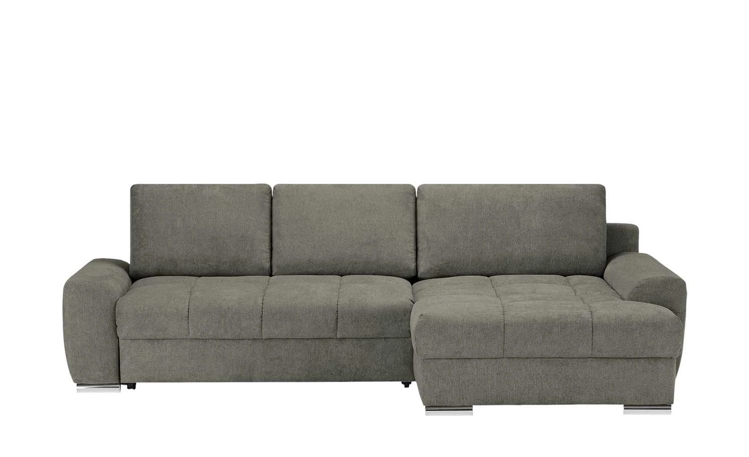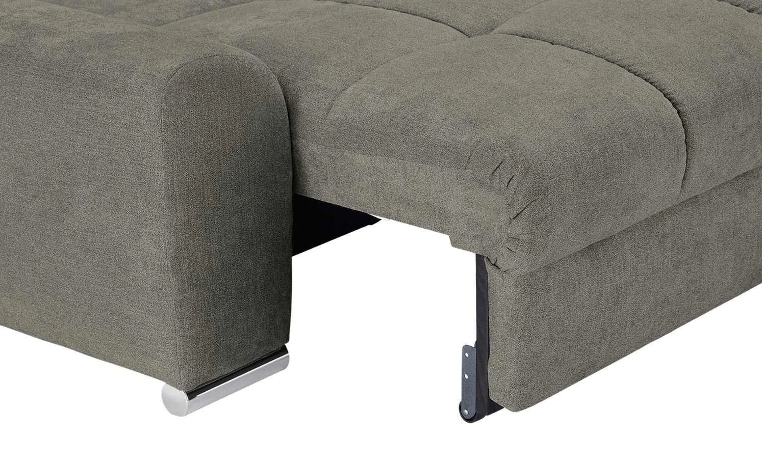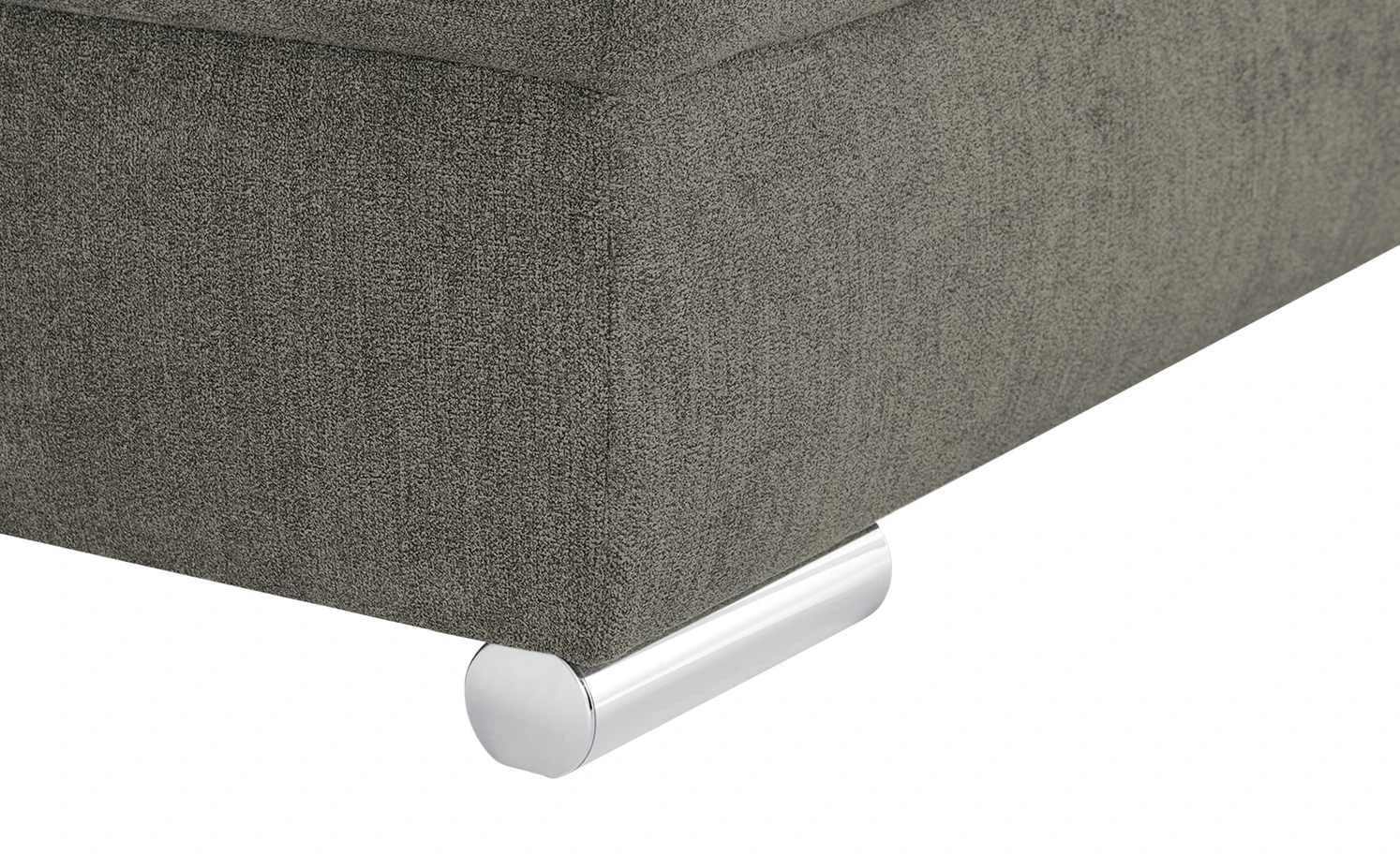 Das Ecksofa Soumia fällt durch die quadratische Steppung seiner Sitzfläche sofort ins Auge. Die Schaumstoffpolsterung und die Wellenunterfederung sorgen für langanhaltenden Sitz- und Liegekomfort. Soumia besitzt eine Schlaffunktion und kann mit wenigen Handgriffen zum Gästebett umfunktioniert werden. Die Bettwäsche für den Besuch können Sie im praktischen Bettkasten unter der Sitzfläche verstauen. Das kompakte Sofa in L-Form ist komplett bezogen und kann auch frei im Raum stehen. Die chromfarbigen Füße passen zum edlen und modernen Erscheinungsbild von Soumia.