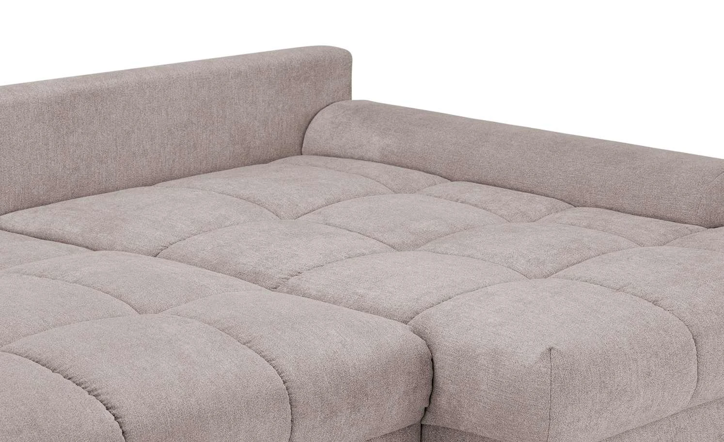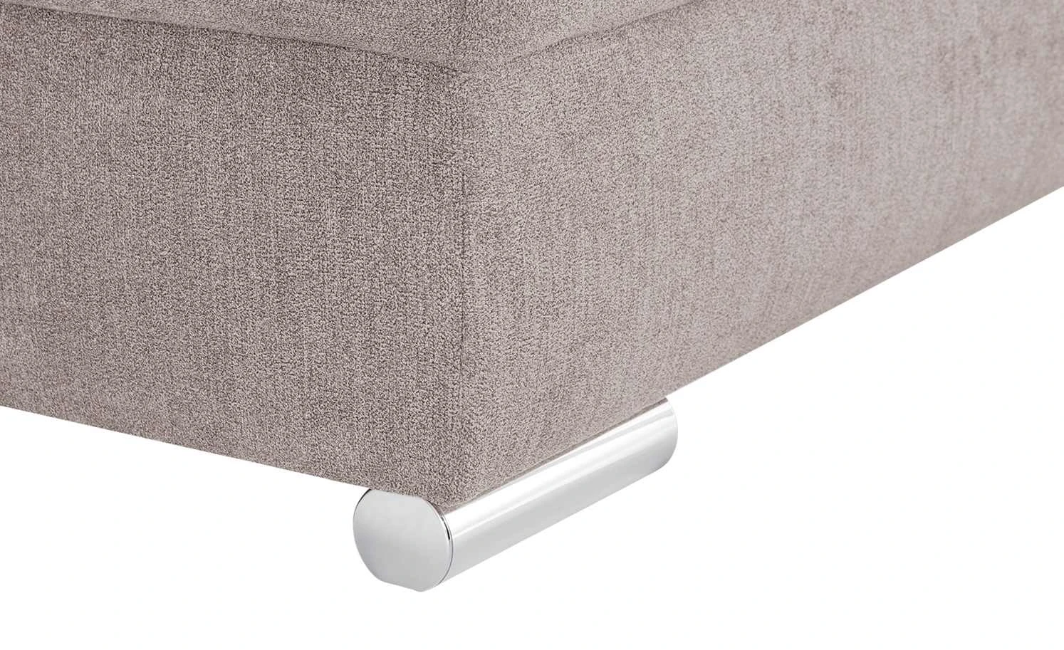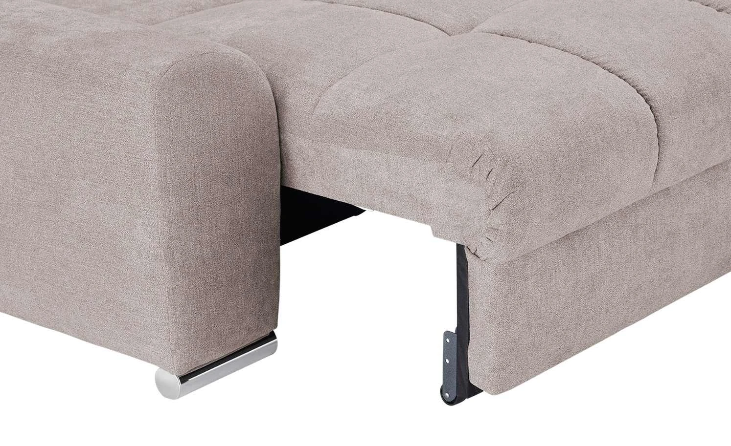 Das Ecksofa Soumia fällt durch die quadratische Steppung seiner Sitzfläche sofort ins Auge. Die Schaumstoffpolsterung und die Wellenunterfederung sorgen für langanhaltenden Sitz- und Liegekomfort. Soumia besitzt eine Schlaffunktion und kann mit wenigen Handgriffen zum Gästebett umfunktioniert werden. Die Bettwäsche für den Besuch können Sie im praktischen Bettkasten unter der Sitzfläche verstauen. Das kompakte Sofa in L-Form ist komplett bezogen und kann auch frei im Raum stehen. Die chromfarbigen Füße passen zum edlen und modernen Erscheinungsbild von Soumia.