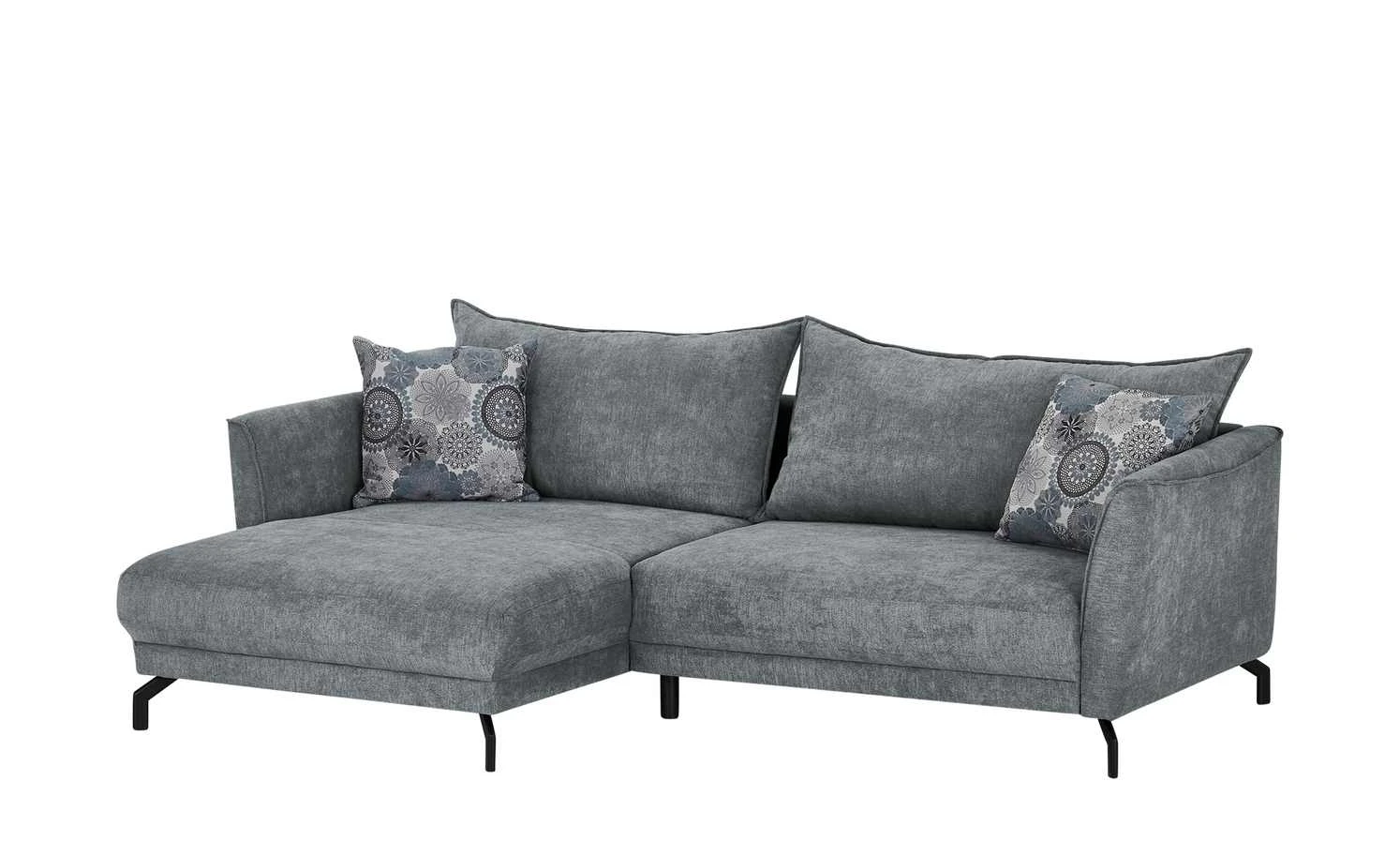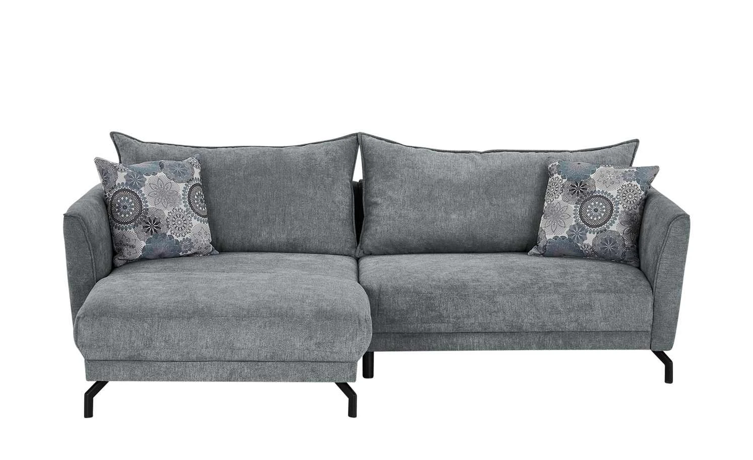 Ein urbaner und gleichzeitig gemütlicher Look macht das Ecksofa Yolanda zum optischen Highlight des Wohnzimmers. Die moderne Linienführung wird durch Winkelfüße aus schwarzem Metall ergänzt. Die beiden Zierkissen mit Mandala-Muster setzen punktuelle Akzente; sie sind im Lieferumfang enthalten. Eine hochwertige Polsterung aus Polyätherschaum sorgt für Sitzkomfort; sie wird durch eine Nosag-Wellenunterfederung unterstützt und noch besser abgefedert. Dank der extra breiten Récamiere können Sie gerne auch mal die Beine hochlegen und so noch besser entspannen. Die Couch ist rundherum mit Mikrofaser bezogen – einschließlich der gesamten Rückseite. Das gibt Ihnen die Möglichkeit Yolanda auch zentral im Raum zu platzieren.