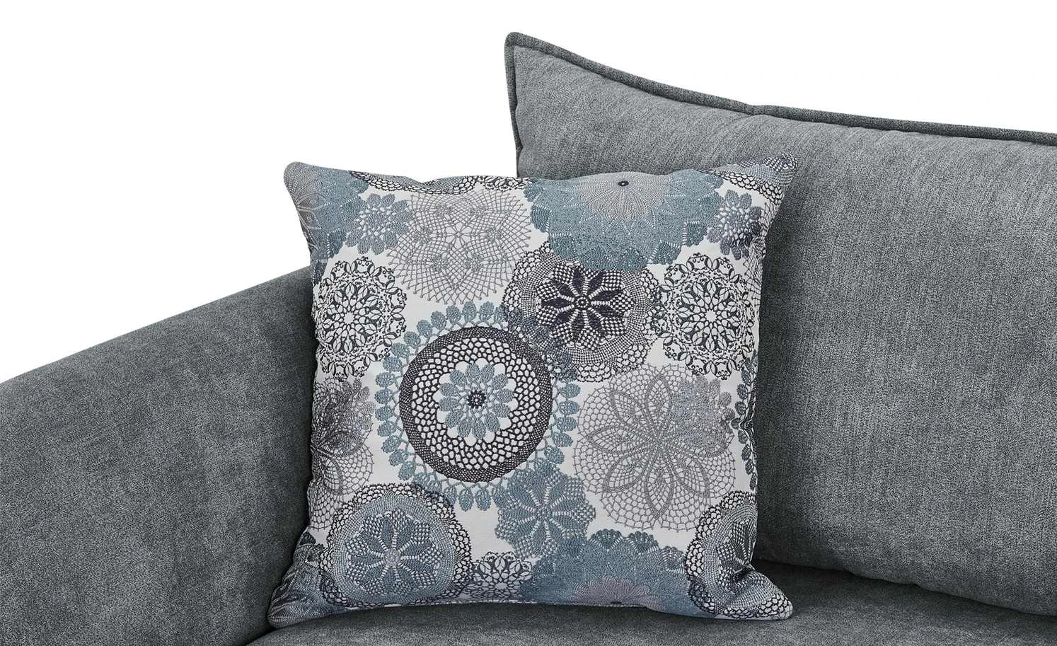 Ein urbaner und gleichzeitig gemütlicher Look macht das Ecksofa Yolanda zum optischen Highlight des Wohnzimmers. Die moderne Linienführung wird durch Winkelfüße aus schwarzem Metall ergänzt. Die beiden Zierkissen mit Mandala-Muster setzen punktuelle Akzente; sie sind im Lieferumfang enthalten. Eine hochwertige Polsterung aus Polyätherschaum sorgt für Sitzkomfort; sie wird durch eine Nosag-Wellenunterfederung unterstützt und noch besser abgefedert. Dank der extra breiten Récamiere können Sie gerne auch mal die Beine hochlegen und so noch besser entspannen. Die Couch ist rundherum mit Mikrofaser bezogen – einschließlich der gesamten Rückseite. Das gibt Ihnen die Möglichkeit Yolanda auch zentral im Raum zu platzieren.