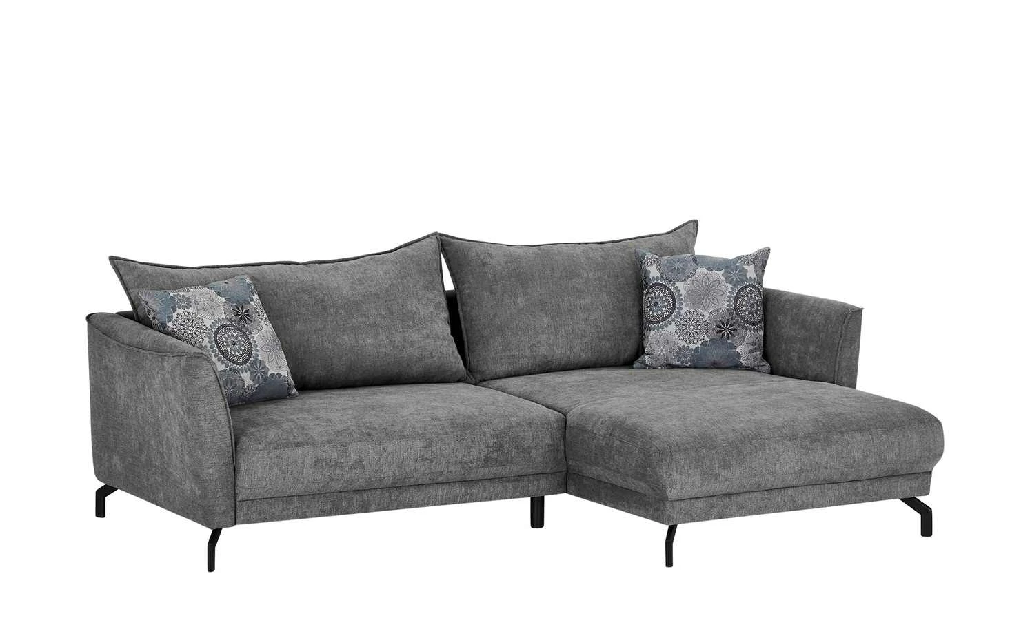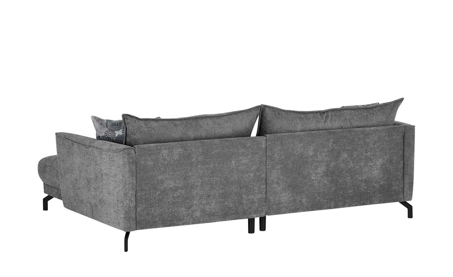 Ein urbaner und gleichzeitig gemütlicher Look macht das Ecksofa Yolanda zum optischen Highlight des Wohnzimmers. Die moderne Linienführung wird durch Winkelfüße aus schwarzem Metall ergänzt. Die beiden Zierkissen mit Mandala-Muster setzen punktuelle Akzente; sie sind im Lieferumfang enthalten. Eine hochwertige Polsterung aus Polyätherschaum sorgt für Sitzkomfort; sie wird durch eine Nosag-Wellenunterfederung unterstützt und noch besser abgefedert. Dank der extra breiten Récamiere können Sie gerne auch mal die Beine hochlegen und so noch besser entspannen. Die Couch ist rundherum mit Mikrofaser bezogen – einschließlich der gesamten Rückseite. Das gibt Ihnen die Möglichkeit Yolanda auch zentral im Raum zu platzieren.