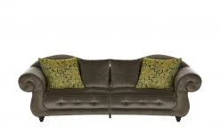 Nobody ist ein opulent designtes Big Sofa mit Vintage-Note. Mit seinem geschwungenen Rücken, den Armlehnen in eingedrehter Optik und Absteppungen fällt es sofort auf. Passend dazu: Der Mikrofaserbezug in Samtoptik. Er umschließt die Couch komplett – auch auf der Rückseite. Deshalb können Sie Nobody frei im Zimmer platzieren. Fünf Kissen sind im Lieferumfang enthalten. Ein Eyecatcher sind die beiden Rücken-Wendekissen mit ihrem auffälligen, goldfarbenen Rankenmuster.
