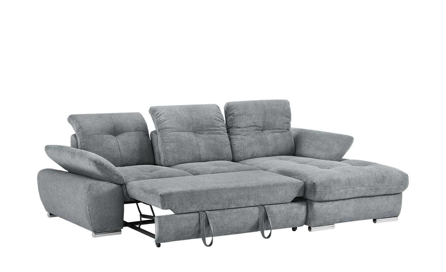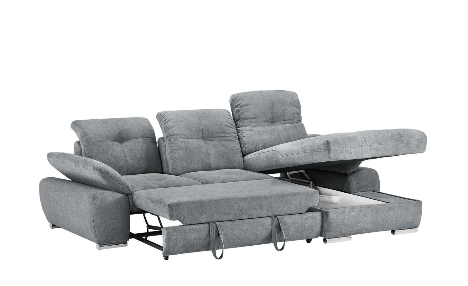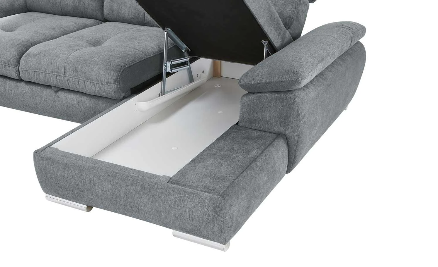 Auf dem Ecksofa Gladys können Sie es sich individuell bequem machen. Alle drei Sitze haben eine manuell verstellbare Sitztiefe. Sie ist zwischen 60 und 85 bzw. bei der Récamiere zwischen 136 und 160 cm variabel die drei Kopfteile und die beiden Armlehnen können Sie ebenfalls in der Position verstellen. Durch die Schlaffunktion kann Gladys auch zum Gästebett ausgezogen werden. In der Récamiere befindet sich ein praktischer Bettkasten in XL-Größe. Die Couch ist komfortabel gepolstert und im Sitzbereich zusätzlich mit einer Nosag-Wellenunterfederung ausgestattet. Ein Mikrofaserbezug umspannt das Sofa komplett, einschließlich der gesamten Rückseite.