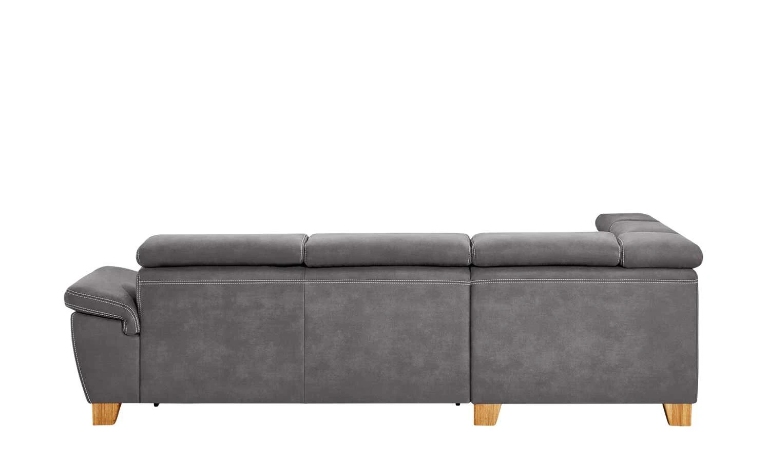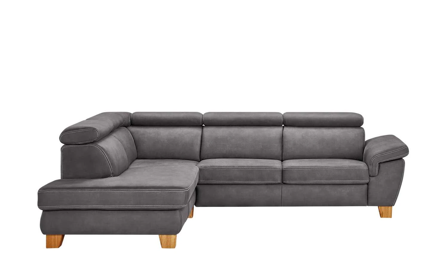 Indra ist ein elegantes und komfortables Ecksofa der Marke Wohnwert. Der dunkle Mikrofaserbezug hat eine leichte Lederoptik. Davon setzen sich die hellen Ziernähte besonders kontrastreich ab. Der originale Bezug ist auch auf der Rückseite des Sofas zu finden. So können Sie es vor eine Wand, aber auch mitten in Ihrem Wohnzimmer platzieren. Viel Sitzkomfort bietet Indra durch den hochwertigen PUR Schaum als Polsterung und die Wellenunterfederung im Sitzbereich. Dank der verstellbaren Kopfteile können Sie sich bequem anlehnen.