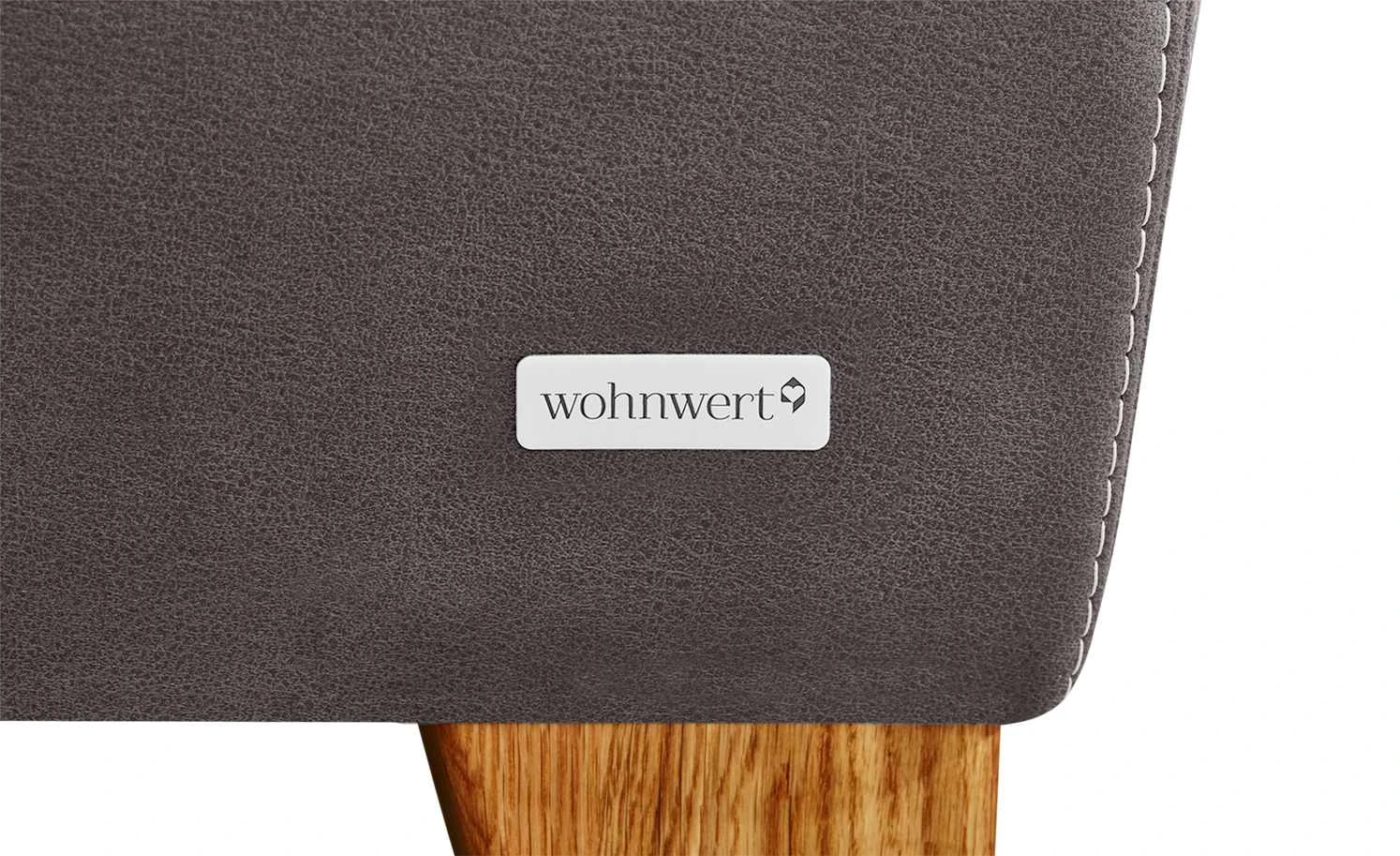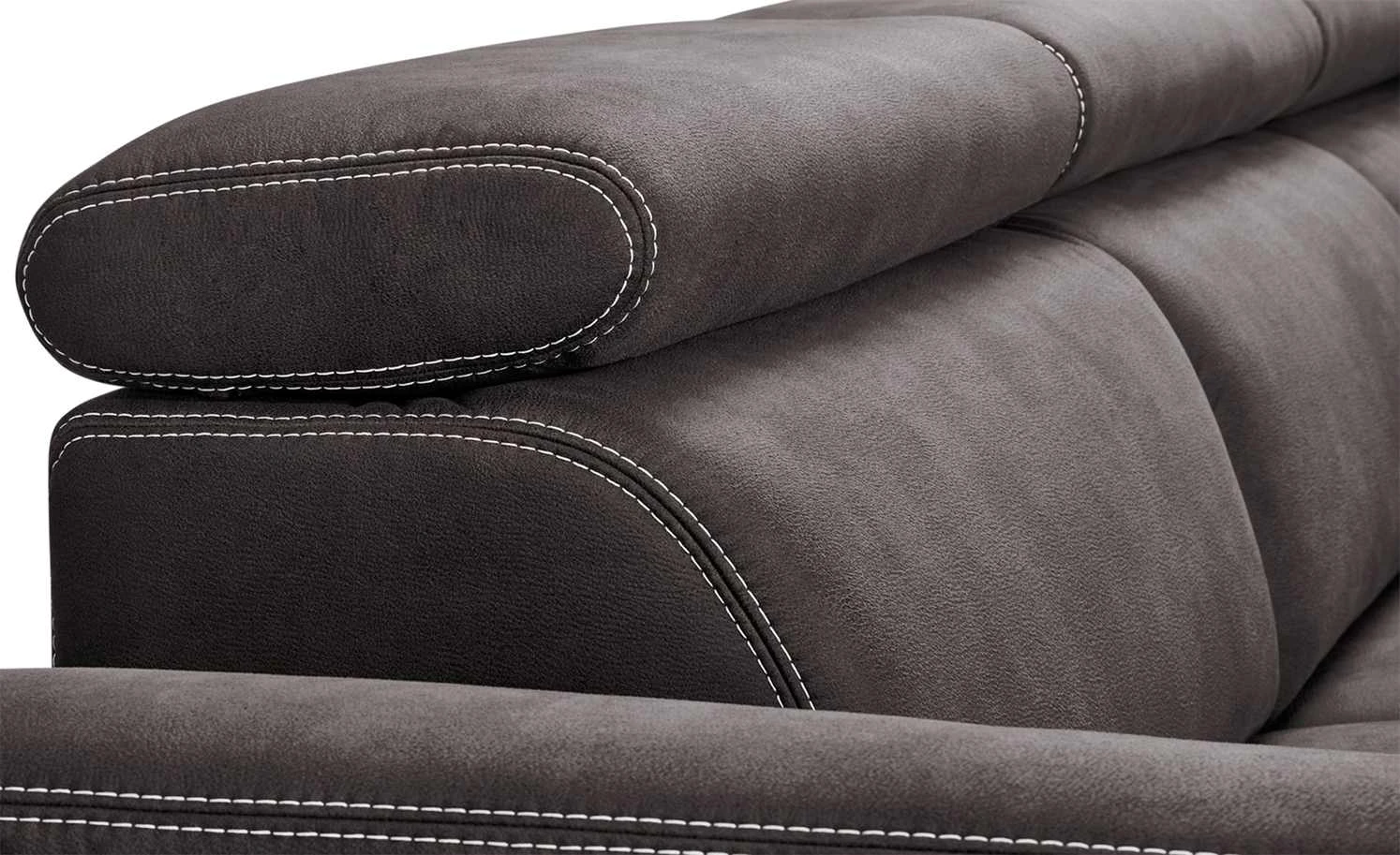 Indra ist ein elegantes und komfortables Ecksofa der Marke Wohnwert. Der dunkle Mikrofaserbezug hat eine leichte Lederoptik. Davon setzen sich die hellen Ziernähte besonders kontrastreich ab. Der originale Bezug ist auch auf der Rückseite des Sofas zu finden. So können Sie es vor eine Wand, aber auch mitten in Ihrem Wohnzimmer platzieren. Viel Sitzkomfort bietet Indra durch den hochwertigen PUR Schaum als Polsterung und die Wellenunterfederung im Sitzbereich. Dank der verstellbaren Kopfteile können Sie sich bequem anlehnen.