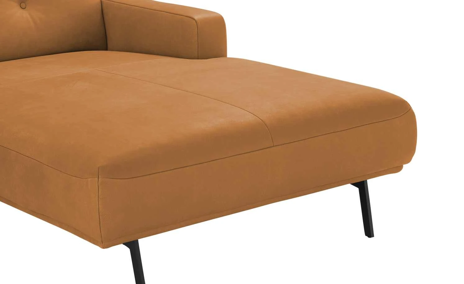 Bei dem Ecksofa Tierra Fuego One werden kultige Retro-Elemente mit dem heutigen Zeitgeist kombiniert. Das Ergebnis im Retro-Chic kann sich sehen lassen: Filigrane, schwarze Metallfüße und hochwertiges Echtleder mit attraktiven Akzenten. Dekorative Zierknöpfe im Rückenbereich werden zum Blickfang und verleihen dem Sofa einen edlen Touch. Elegant wird es durch die längs verlaufenden Nähte auf der Außenseite des Sofas. Armlehnen und Sofarückseite sind dadurch ebenfalls dekorativ. Sie können das Ecksofa daher problemlos als charakterstarkes Central-Piece mittig im Raum platzieren. Machen Sie es sich bequem und strecken Sie sich auf der breiten Ottomane aus. Das Ecksofa Tierra Fuego One lässt keine Wünsche an den Komfort offen.