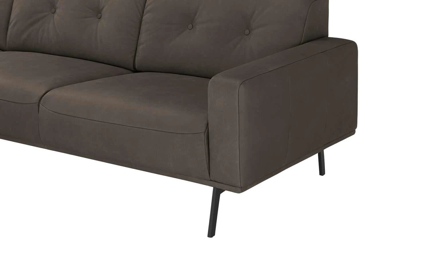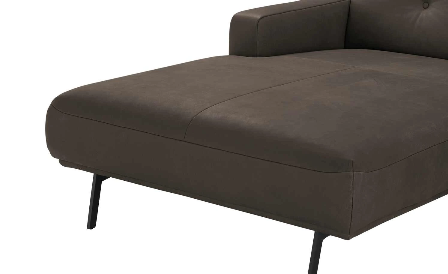 Bei dem Ecksofa Tierra Fuego One werden kultige Retro-Elemente mit dem heutigen Zeitgeist kombiniert. Das Ergebnis im Retro-Chic kann sich sehen lassen: Filigrane, schwarze Metallfüße und hochwertiges Echtleder mit attraktiven Akzenten. Dekorative Zierknöpfe im Rückenbereich werden zum Blickfang und verleihen dem Sofa einen edlen Touch. Elegant wird es durch die längs verlaufenden Nähte auf der Außenseite des Sofas. Armlehnen und Sofarückseite sind dadurch ebenfalls dekorativ. Sie können das Ecksofa daher problemlos als charakterstarkes Central-Piece mittig im Raum platzieren. Machen Sie es sich bequem und strecken Sie sich auf der breiten Ottomane aus. Das Ecksofa Tierra Fuego One lässt keine Wünsche an den Komfort offen.