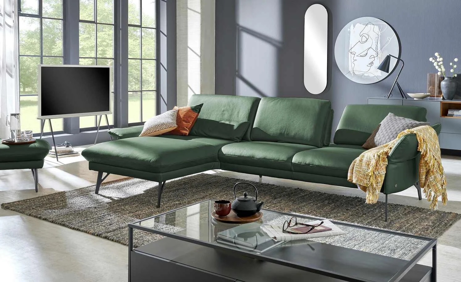 Dieses Sofa verbindet hochwertiges Echtleder und anthrazitfarbenes Metall zu einem loftig-modernen Design. Durch seine Kombination aus Polster in Markenqualität und zeitgemäßen Funktionen entsteht eine wahre Komfort-Oase, die sich sehen lassen kann. Verstellen Sie die Armlehnen mit nur einem Handgriff und passen Sie die Sitztiefe ganz Ihren Wünschen an. Strecken Sie sich auf der Ottomane aus und genießen Sie Zeit mit Freunden und Familie. Übrigens: Mit der passenden Kopfstütze und dem Hocker der Serie 1928 lässt sich das Ecksofa individuell Ihren Bedürfnissen anpassen. Polster gefertigt im bayrischen Taufkirchen: Von Menschen für Menschen. Die hochwertigen Funktionsmöbel der Marke himolla besitzen durchdachte Verstellfunktionen und begleiten Sie ein ganzes Möbelleben lang.