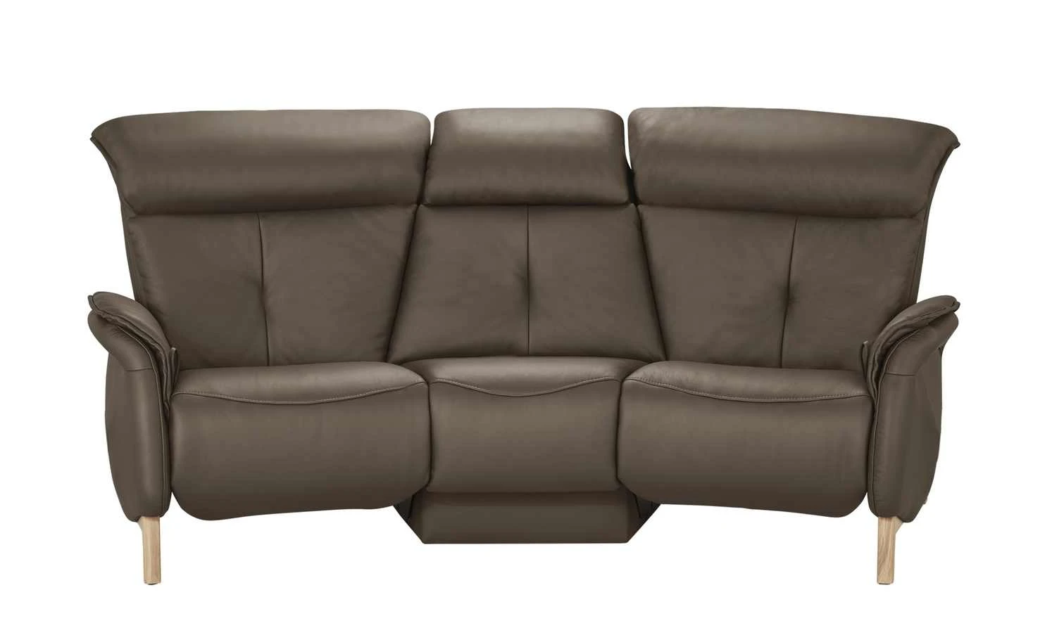 Lassen Sie den Tag ausklingen und genießen Sie entspannte Stunden vor dem Fernseher. Dieses komfortable Ledersofa kombiniert dicke Polsterbereiche mit einer integrierten Relaxfunktion. Die beiden äußeren Sitze lassen sich kinderleicht in Relaxposition stellen: Unabhängig voneinander. Klappen Sie das Mittelteil ganz einfach um, wenn Sie einen praktischen Beistelltisch benötigen. Hier finden Getränke, Snacks und die Fernbedienung problemlos Platz. Ein edler Echtlederbezug mit dekorativen Nähten umspannt das gesamte Sofa. Absteppungen betonen die dicken Polsterbereiche und geben dem Markensofa eine moderne Note. Bewusst gesetzte Akzente aus Wildeichen-Massivholz verleihen dem Ledersofa außerdem einen natürlichen Touch.