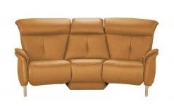 Lassen Sie den Tag ausklingen und genießen Sie entspannte Stunden vor dem Fernseher. Dieses komfortable Ledersofa kombiniert dicke Polsterbereiche mit einer integrierten Relaxfunktion. Die beiden äußeren Sitze lassen sich kinderleicht in Relaxposition stellen: Unabhängig voneinander. Klappen Sie das Mittelteil ganz einfach um, wenn Sie einen praktischen Beistelltisch benötigen. Hier finden Getränke, Snacks und die Fernbedienung problemlos Platz. Ein edler Echtlederbezug mit dekorativen Nähten umspannt das gesamte Sofa. Absteppungen betonen die dicken Polsterbereiche und geben dem Markensofa eine moderne Note. Bewusst gesetzte Akzente aus Wildeichen-Massivholz verleihen dem Ledersofa außerdem einen natürlichen Touch.