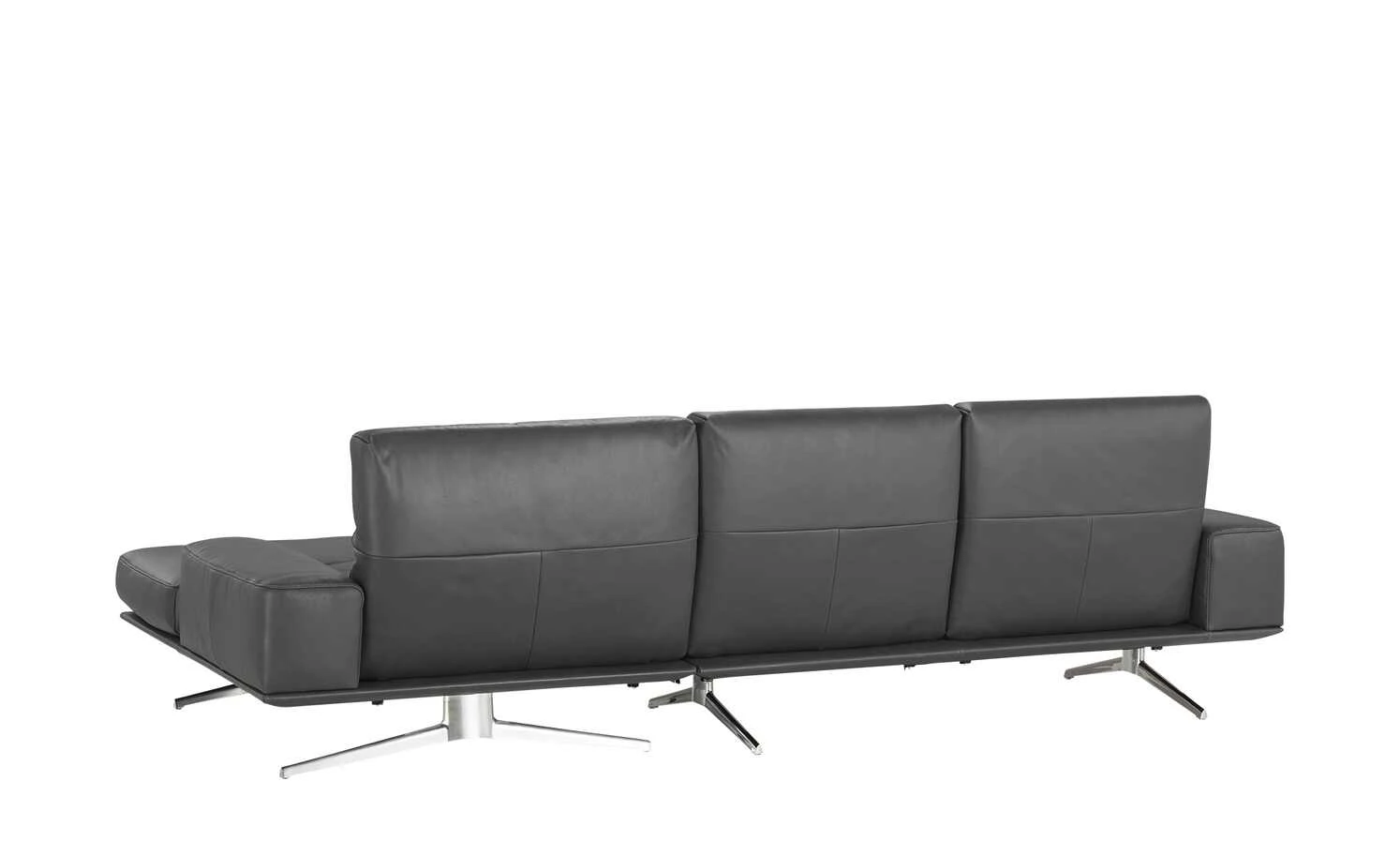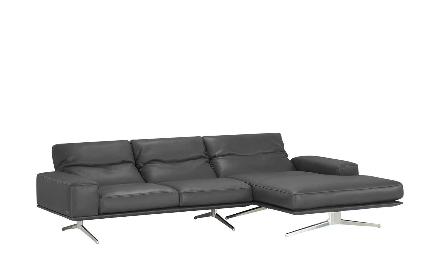 Das Ecksofa Hiero verbindet kubistische Design-Elemente mit einer modernen, klaren Linienführung. Akzentuiert wird dieser Designentwurf mit attraktiven Kontrasten in Material und Farbe. Nehmen Sie Platz und strecken Sie sich auf der extra breiten Ottomane bequem aus. Passen Sie die drei Rückenlehnen ganz Ihren Bedürfnissen an: Sie lassen sich mühelos und separat voneinander neigen. Die beiden breiten Armlehnen flankieren die Sitzfläche gekonnt und lenken den Fokus auf die einladende Sitzfläche. Der hochwertige Echtlederbezug umspannt das gesamte Sofa und setzt mit seiner Kontrastnaht liebevolle Akzente. Filigrane Schwertkufen aus poliertem Metall tragen das Ecksofa und scheinen es nahezu schweben zu lassen. Unikate gefertigt in Bayern: Die Marke KOINOR steht für einzigartige Komfortfunktionen und individuelles Design. Unter Verwendung hochwertigster Materialien entstehen Möbel mit Vorzeigecharakter.