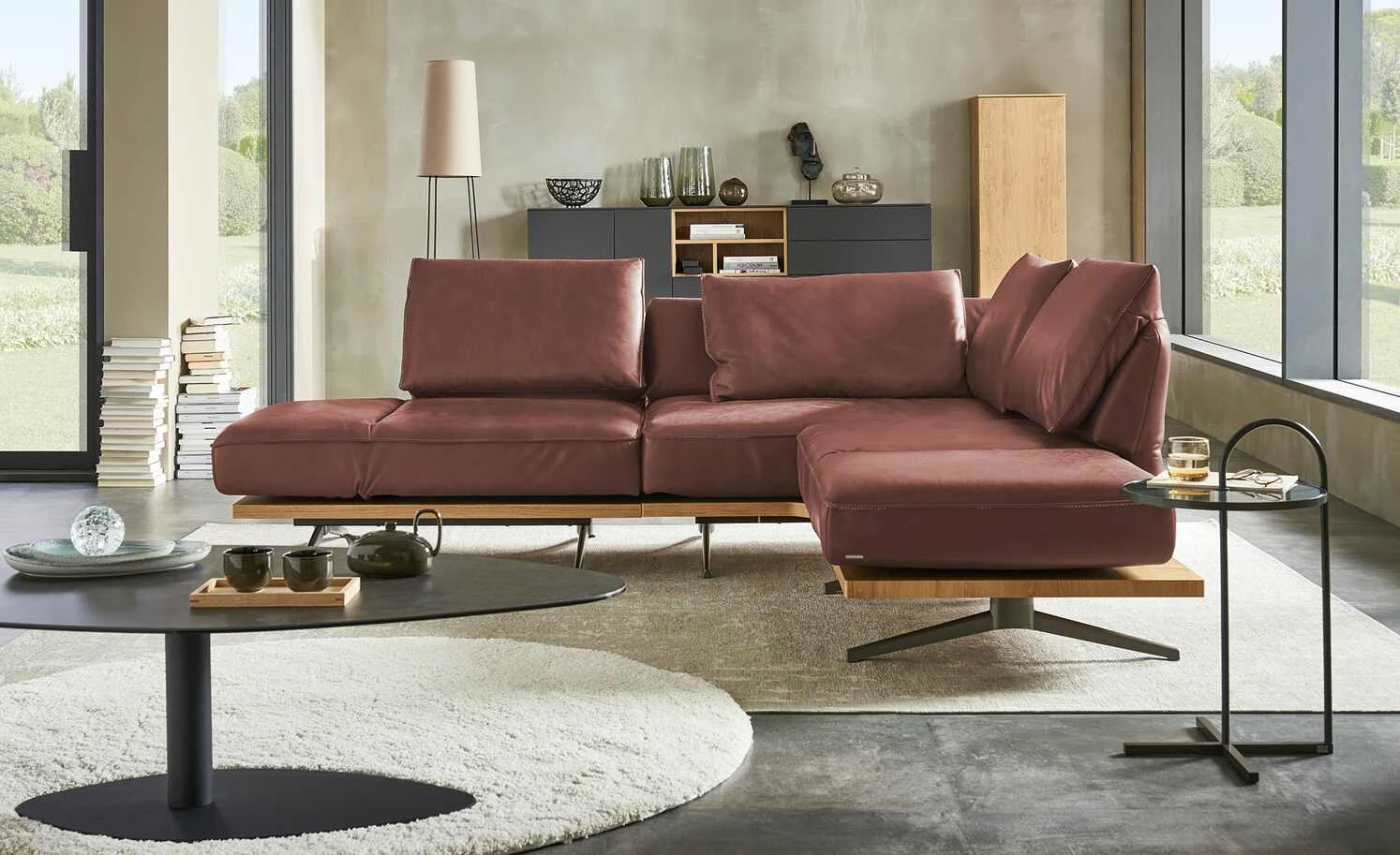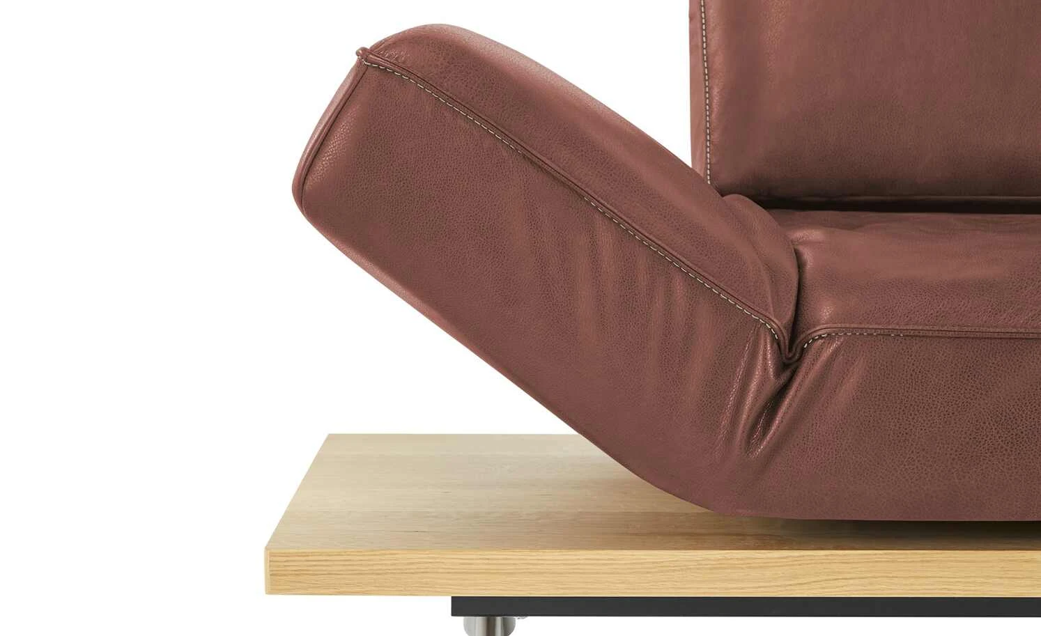 Beim Ecksofa Phoenix vereinigen sich ausgeklügelte Funktionen und exklusives Design. Dieses Zusammenspiel und liebevolle Details machen das Ecksofa Phoenix zu einem absoluten Lieblingsmöbelstück. Weiches Anilinleder zeigt die Original-Beschaffenheit der Haut. Eine dekorative Kontrastnaht setzt attraktive Akzente. Die handgearbeiteten Polster liegen auf einem Massivholz-Plateau aus Wildeiche auf. Bronzierte Schwertkufen tragen das Plateau und scheinen das Sofa schweben zu lassen. Klappen Sie die Kopfteile und die Armlehnen ganz einfach um: Phoenix passt sich Ihren Bedürfnissen ganz individuell an.