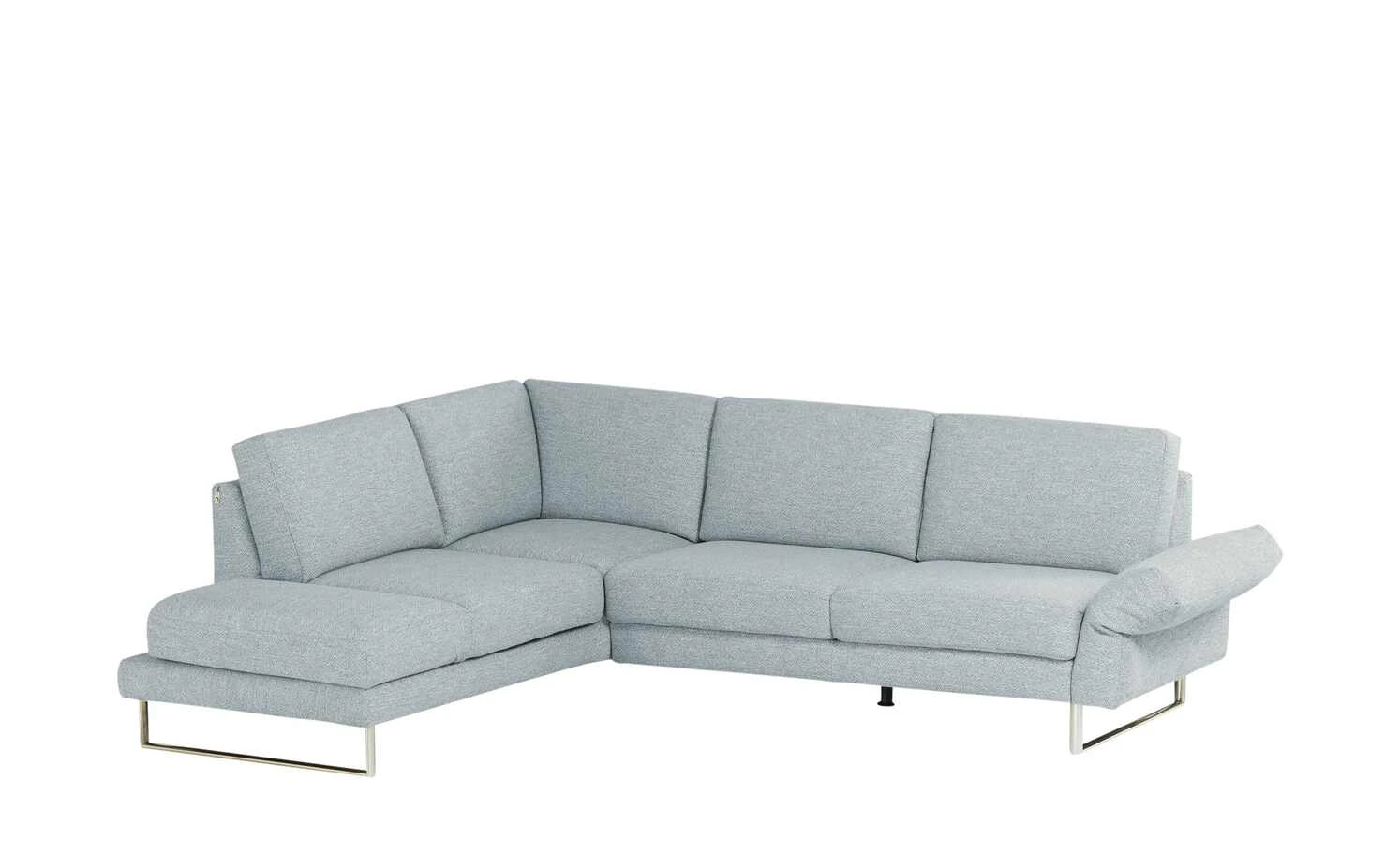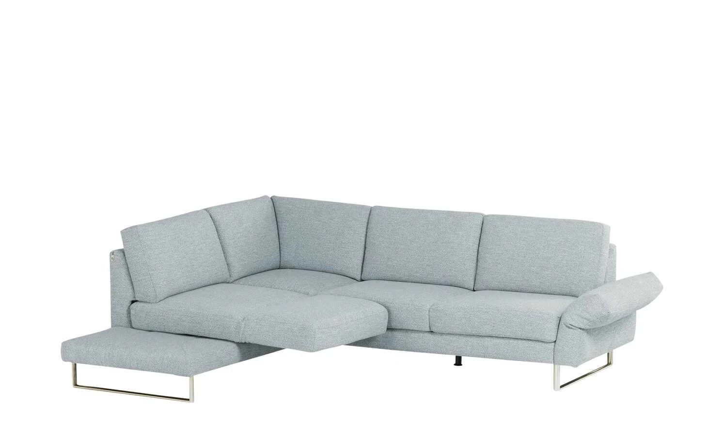 Moderne Elemente und zeitgemäße Funktionen machen das Ecksofas Upgrade von KOINOR zu einem absolut stilsicheren Komfortmöbel. Glänzende Metallkufenfüße aus satiniertem Nickel tragen das einladende Ecksofa und harmonieren mit dem attraktiven Bezug aus strapazierfähigem, sorgfältig verarbeitetem Flachgewebe. Nehmen Sie Platz und erschaffen Sie mit der äußeren, schwenkbaren Sitzfläche eine praktische Ottomane. Die schwenkbare Sitzfläche und auch die Armlehne auf der anderen Seite lassen sich mit nur einem Handgriff hoch- und umklappen. So passt sich das Ecksofa Upgrade immer genau Ihren Wünschen und Bedürfnissen an. Entscheiden Sie sich für Ihre Lieblingsbezugsfarbe und ergänzen Sie das Sofa mit den Nieren- und Dekokissen von Upgrade. Auch Kopfstützen für Upgrade sind separat erhältlich und passen perfekt zum Ecksofa. Unikate gefertigt in Bayern: Die Marke KOINOR steht für einzigartige Komfortfunktionen und individuelles Design. Unter Verwendung hochwertigster Materialien entstehen Möbel mit Vorzeigecharakter.