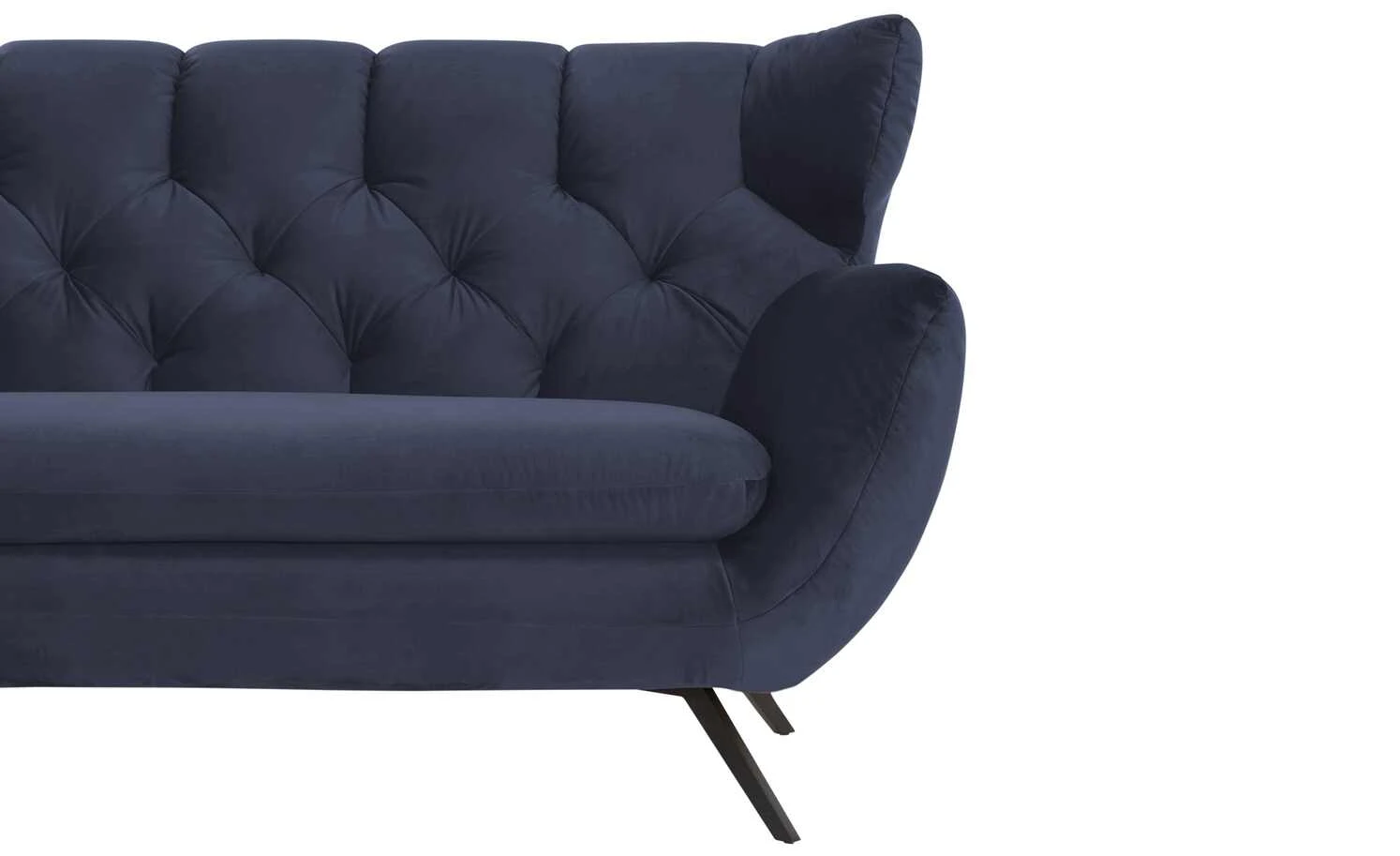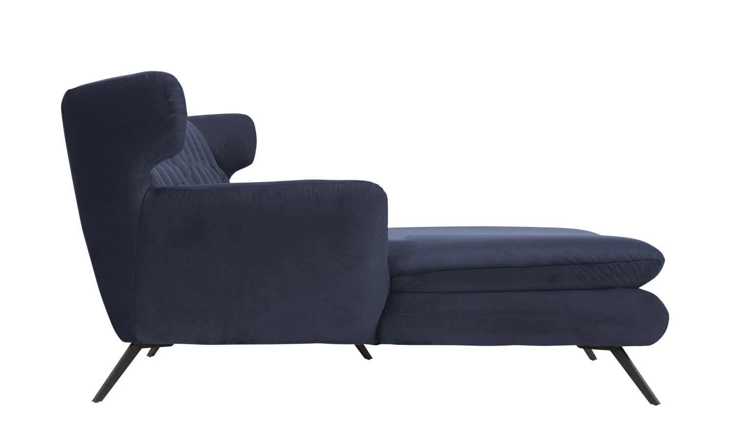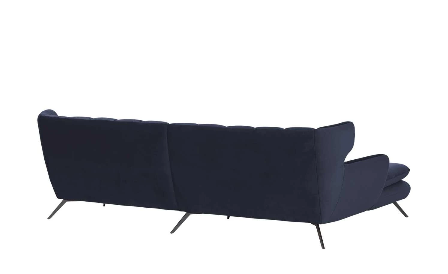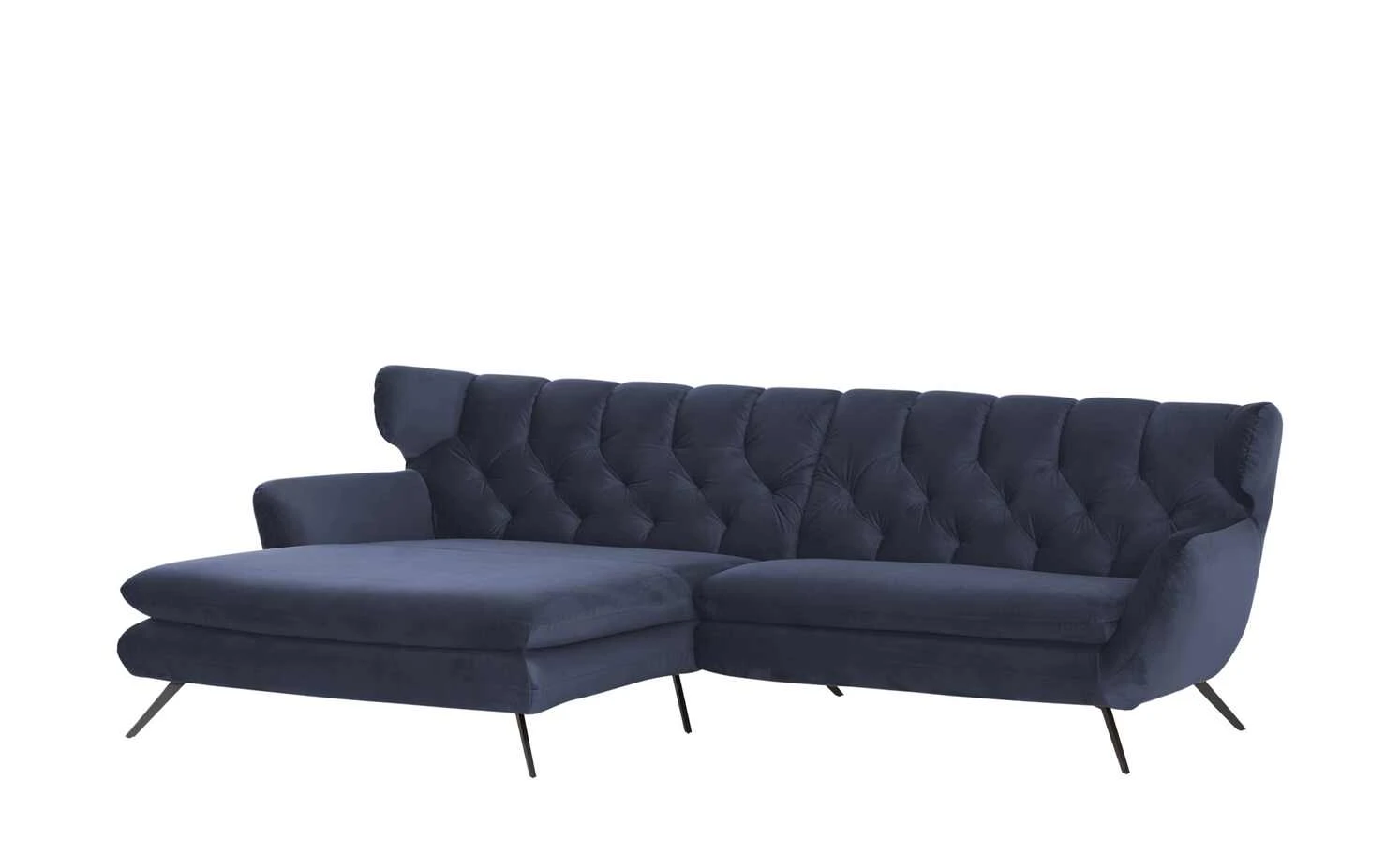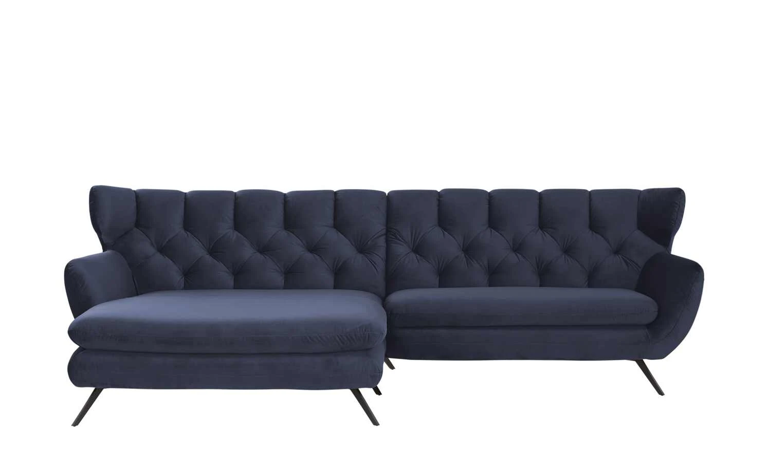 Das Ecksofa Caldara besticht durch seinen attraktiven Retro-Charme. Die hohe, gesteppte Rückenlehne besitzt Ohren wie an einem Ohrensessel und ist damit das absolute Highlight. Das Sofa inklusive seiner Armlehnen und Rückseite ist mit einem samtig weichen, leicht schimmernden Stoff bezogen. Dadurch kann das edle Sofa auch mittig im Raum platziert werden. Schmale, zierliche Füße aus schwarzem Metall tragen die großzügige Sitzfläche, auf der Sie sich auch gemütlich ausstrecken können. Übrigens: Kombinieren Sie die komfortable Eckcouch mit dem gleichnamigem Loveseat und schaffen Sie sich eine Wohlfühl-Oase zum Relaxen.