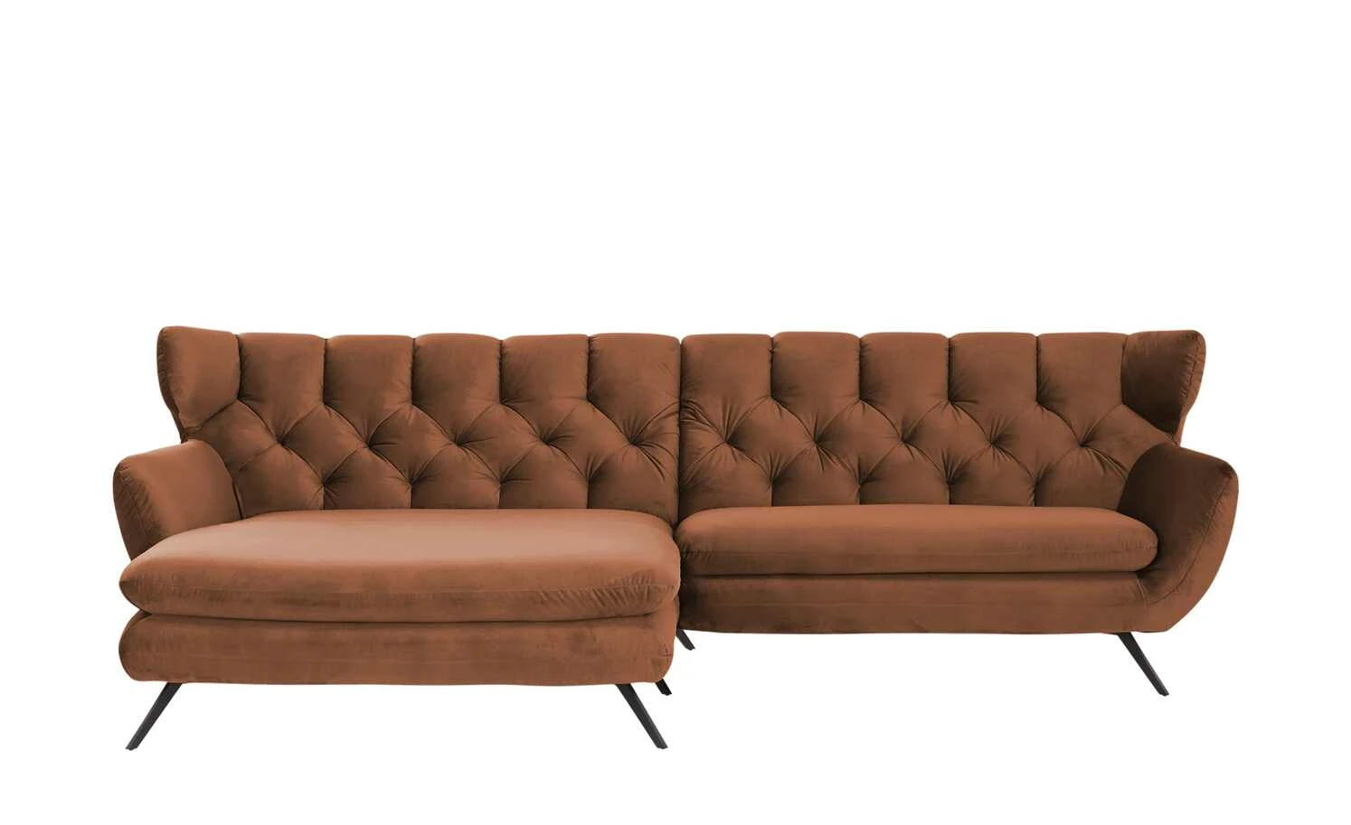 Das Ecksofa Caldara besticht durch seinen attraktiven Retro-Charme. Die hohe, gesteppte Rückenlehne besitzt Ohren wie an einem Ohrensessel und ist damit das absolute Highlight. Das Sofa inklusive seiner Armlehnen und Rückseite ist mit einem samtig weichen, leicht schimmernden Stoff bezogen. Dadurch kann das edle Sofa auch mittig im Raum platziert werden. Schmale, zierliche Füße aus schwarzem Metall tragen die großzügige Sitzfläche, auf der Sie sich auch gemütlich ausstrecken können. Übrigens: Kombinieren Sie die komfortable Eckcouch mit dem gleichnamigem Loveseat und schaffen Sie sich eine Wohlfühl-Oase zum Relaxen.