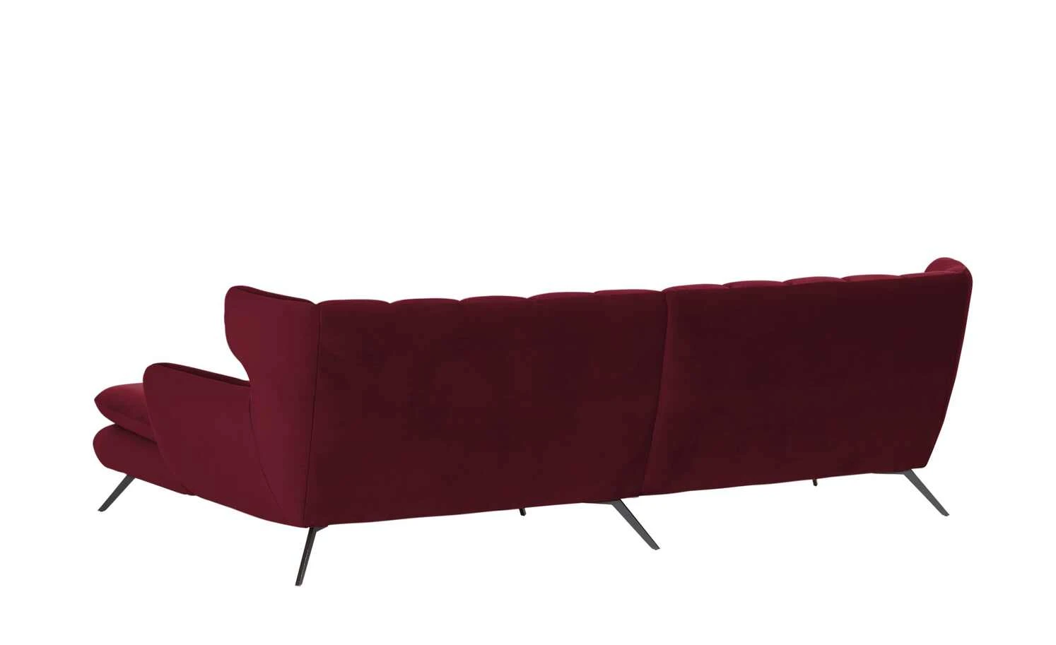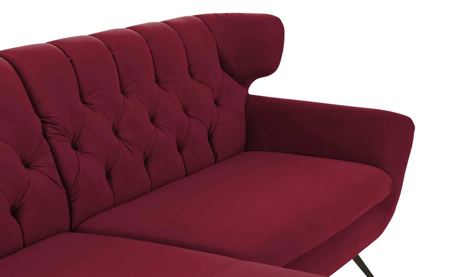 Das Ecksofa Caldara besticht durch seinen attraktiven Retro-Charme. Die hohe, gesteppte Rückenlehne besitzt Ohren wie an einem Ohrensessel und ist damit das absolute Highlight. Das Sofa inklusive seiner Armlehnen und Rückseite ist mit einem samtig weichen, leicht schimmernden Stoff bezogen. Dadurch kann das edle Sofa auch mittig im Raum platziert werden. Schmale, zierliche Füße aus schwarzem Metall tragen die großzügige Sitzfläche, auf der Sie sich auch gemütlich ausstrecken können. Übrigens: Kombinieren Sie die komfortable Eckcouch mit dem gleichnamigem Loveseat und schaffen Sie sich eine Wohlfühl-Oase zum Relaxen.