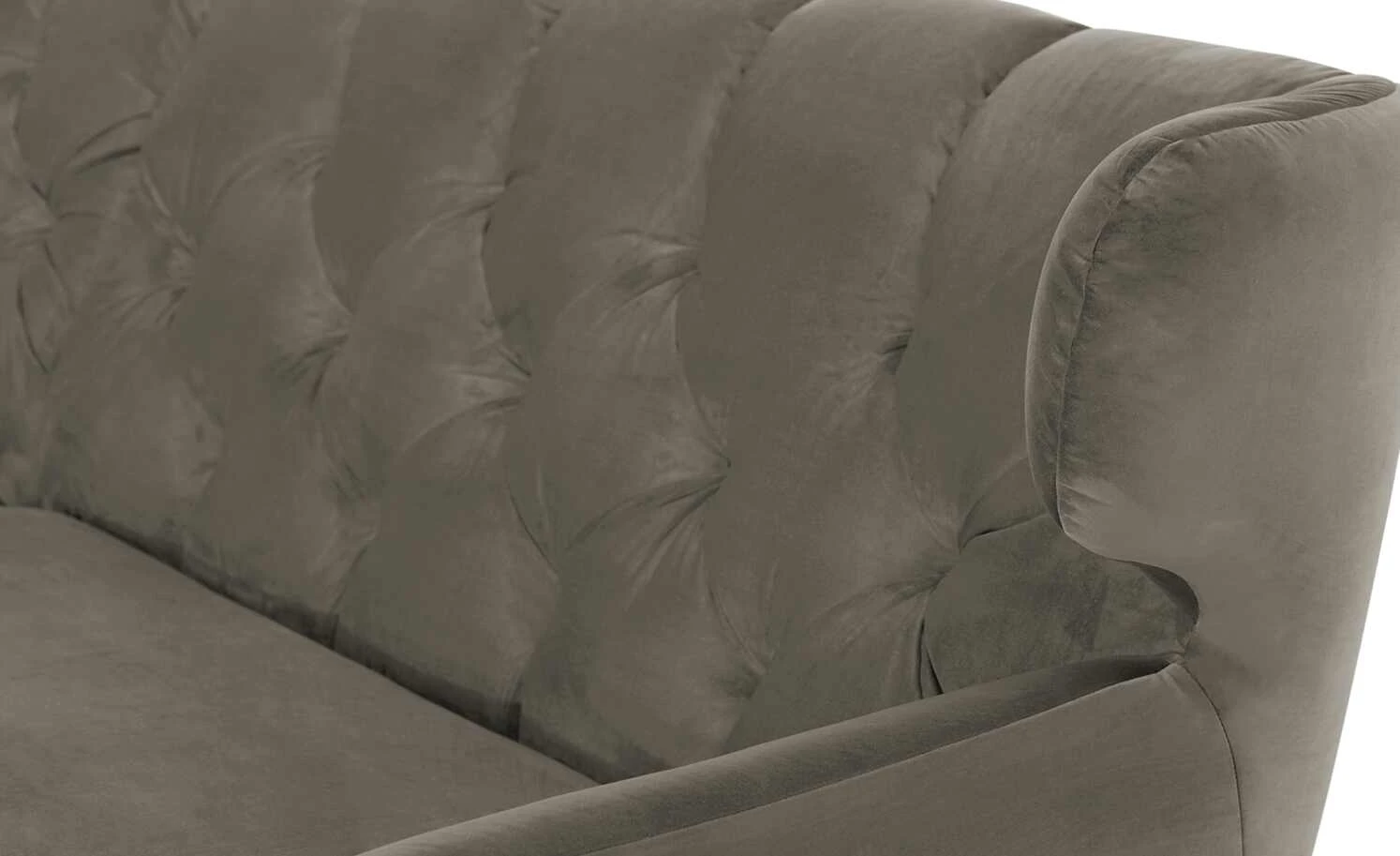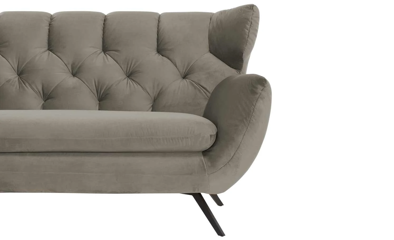 Das Ecksofa Caldara besticht durch seinen attraktiven Retro-Charme. Die hohe, gesteppte Rückenlehne besitzt Ohren wie an einem Ohrensessel und ist damit das absolute Highlight. Das Sofa inklusive seiner Armlehnen und Rückseite ist mit einem samtig weichen, leicht schimmernden Stoff bezogen. Dadurch kann das edle Sofa auch mittig im Raum platziert werden. Schmale, zierliche Füße aus schwarzem Metall tragen die großzügige Sitzfläche, auf der Sie sich auch gemütlich ausstrecken können. Übrigens: Kombinieren Sie die komfortable Eckcouch mit dem gleichnamigem Loveseat und schaffen Sie sich eine Wohlfühl-Oase zum Relaxen.
