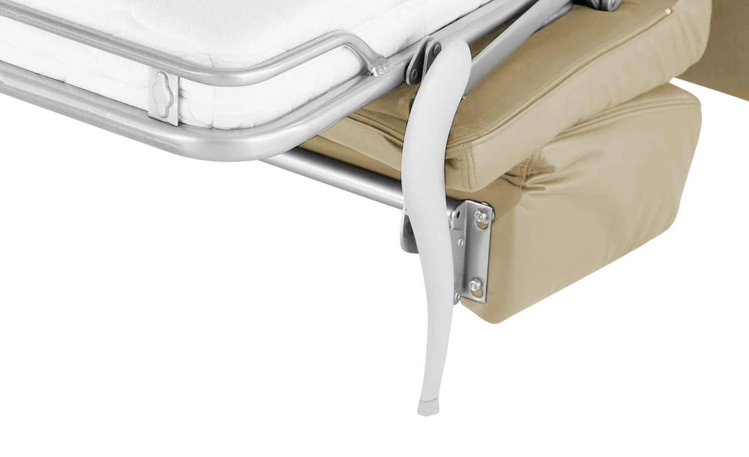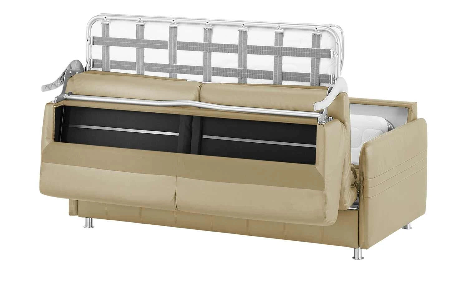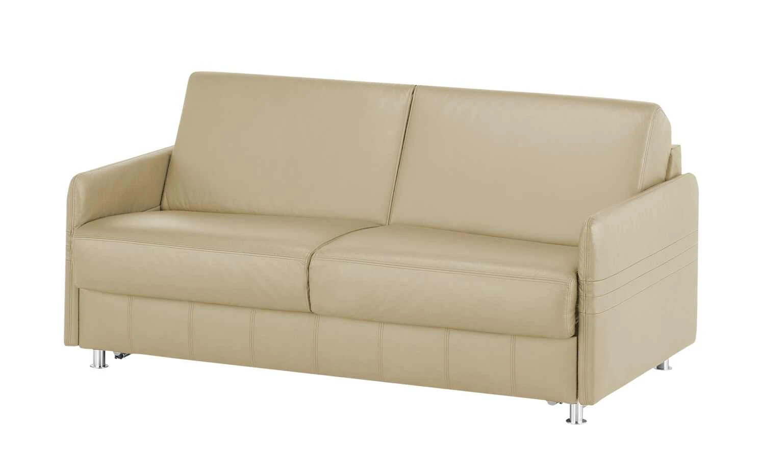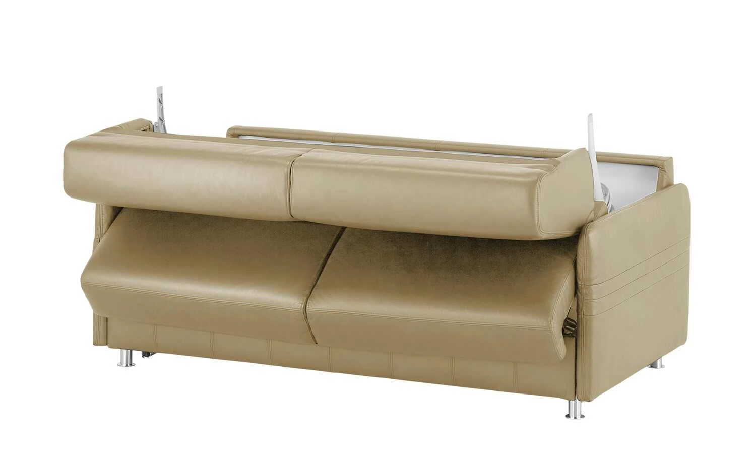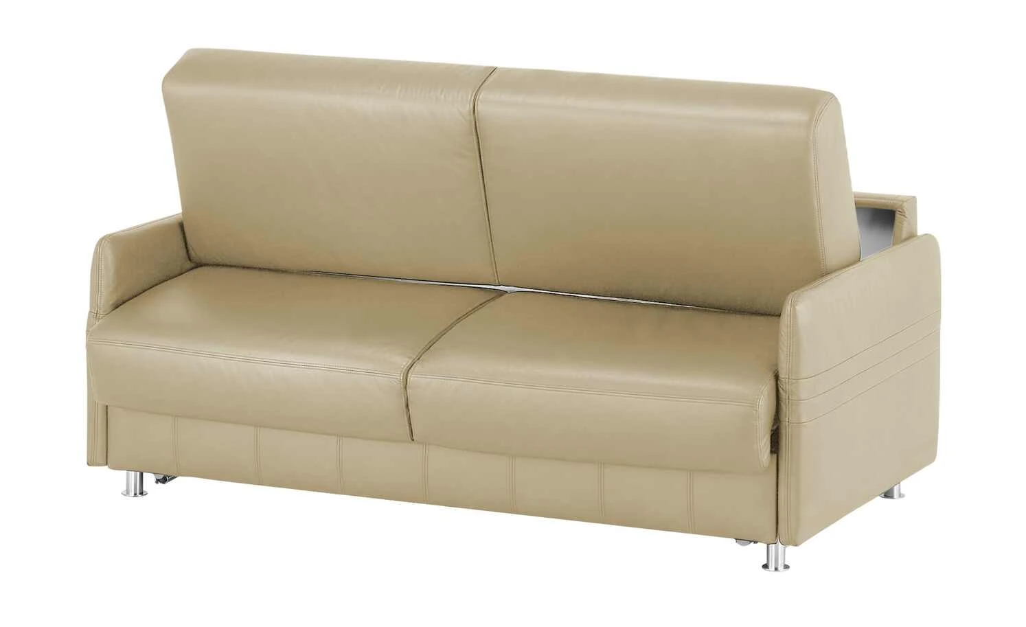 Das Schlafsofa München wirkt durch seinen Bezug aus echtem Rindsleder edel und modern. Der Stoff glänzt leicht und besitzt dezente Ziernähte. Die Metallfüße in Edelstahl-Optik veredeln außerdem das Gesamterscheinungsbild. Die komfortable Polsterung aus Kaltschaum und die klappbaren Armlehnen sorgen für gemütliche Stunden auf dem Sofa. Das Schlafsofa lässt sich mit wenigen Handgriffen zu einem Gästebett für zwei Personen ausklappen. Die 15 Zentimeter hohe Matratze liegt dann auf einem Gestell mit integriertem Lattenrost auf.