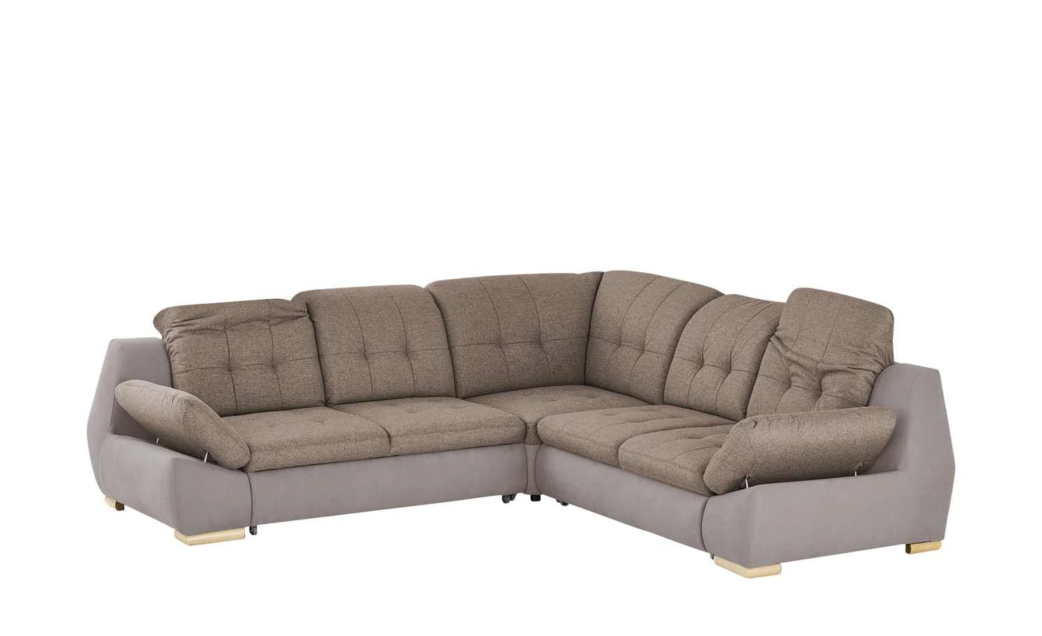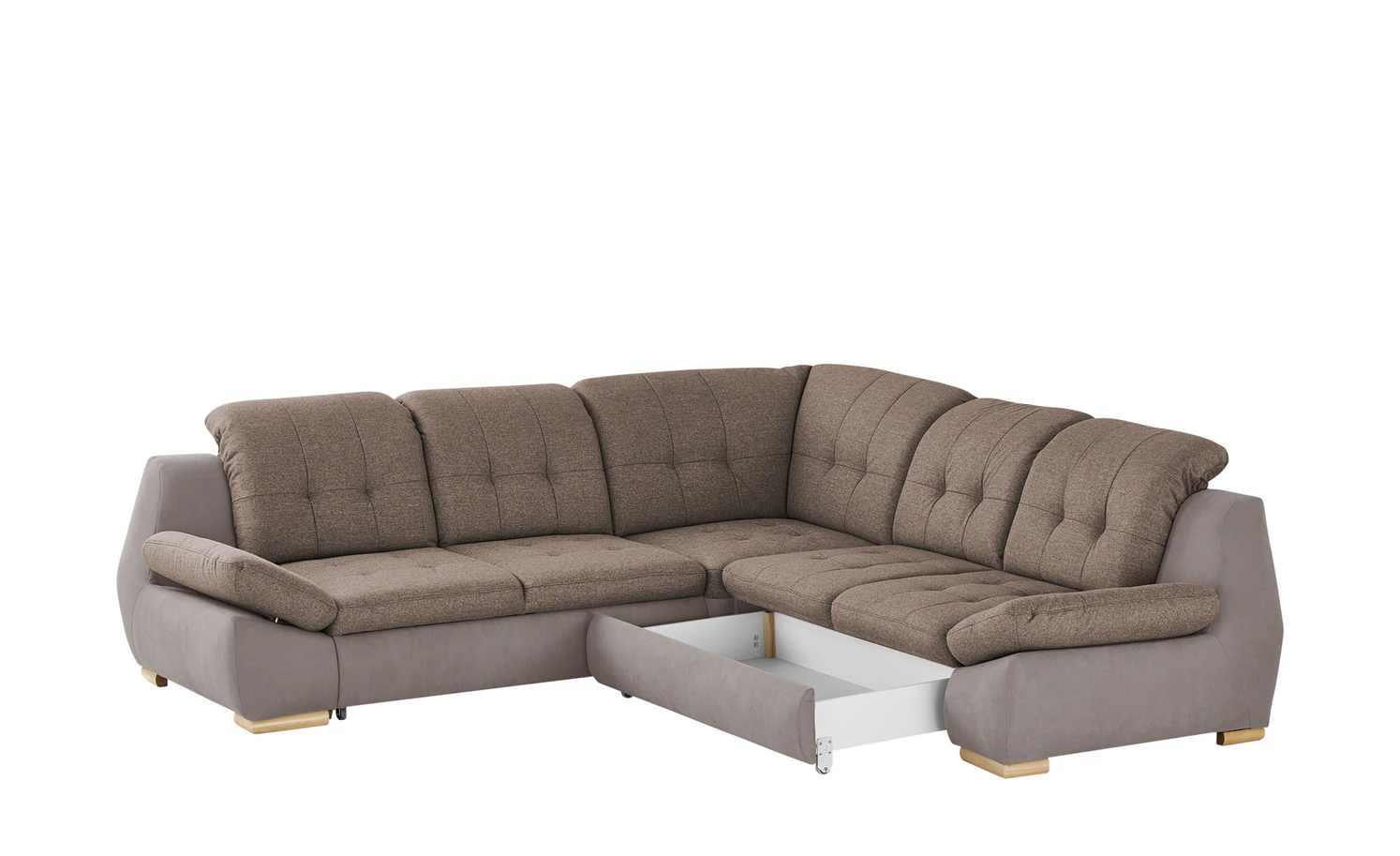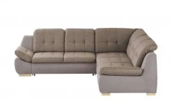 Das Ecksofa Lilli punktet mit seinen tollen Komfortausstattungen. Sitz, Rücken und Armlehnen sind mit einem hochwertigen Federkern und zusätzlichem Polyätherschaum gepolstert. Die Rückenlehne hat eine angenehme Höhe und ist leicht schräg, so dass Sie noch bequemer Sitzen können. Außerdem lassen sich die Kopfteile von zwei Sitzen verstellen. Beide Armlehnen sind mit einer Klappfunktion ausgestattet. Lilli kann mit wenigen Handgriffen zum Gästebett ausgezogen werden. Unter der Sitzfläche befindet sich ein ausziehbarer Bettkasten, der praktischen Stauraum bietet. Die Couch ist zweifarbig gestaltet. Während der Korpus mit einem Flachgewebe bezogen ist, auch auf der Rückseite, setzt sich die Sitz- und Rückenfläche vorne mit ihrem Webstoff ab.