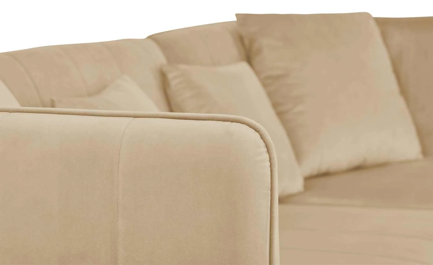 Edel und komfortabel zugleich: Das Ecksofa Sara fällt durch seinen leicht schimmernden Bezug aus samtig weicher Mikrofaser sofort auf. Der Stoff ist längs gesteppt – und das an allen Seiten. Sie können Sara daher auch problemlos mittig im Raum platzieren. Die hochwertige Schaumstoffpolsterung und die Wellenunterfederung sorgen für langanhaltenden Sitzkomfort. Vier weiche Zierkissen sind im Lieferumfang enthalten, sodass Sie es sich noch gemütlicher machen können. Schwarze Kegelfüße aus massivem Buchenholz runden den edlen Look von Sara gekonnt ab.
