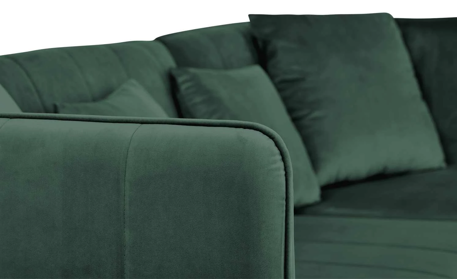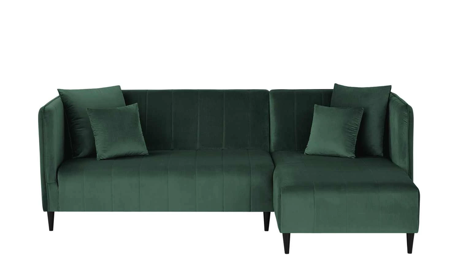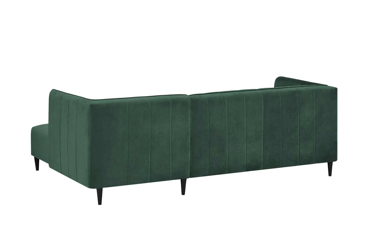 Edel und komfortabel zugleich: Das Ecksofa Sara fällt durch seinen leicht schimmernden Bezug aus samtig weicher Mikrofaser sofort auf. Der Stoff ist längs gesteppt – und das an allen Seiten. Sie können Sara daher auch problemlos mittig im Raum platzieren. Die hochwertige Schaumstoffpolsterung und die Wellenunterfederung sorgen für langanhaltenden Sitzkomfort. Vier weiche Zierkissen sind im Lieferumfang enthalten, sodass Sie es sich noch gemütlicher machen können. Schwarze Kegelfüße aus massivem Buchenholz runden den edlen Look von Sara gekonnt ab.