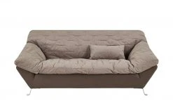 Überaus gemütlich und einladend – so wirkt das Sofa Cher. Und genauso bequem ist die Couch auch. Dafür sorgt eine weiche Polsterung mit zusätzlicher Nosag-Wellenunterfederung. Die Rückenlehne hat eine angenehme Höhe, um sich komfortabel anzuschmiegen. Das mitgelieferte Zierkissen können Sie bei Bedarf in den Rücken legen. Cher bietet Platz für drei Personen. Das Sofa ist rundum mit Mikrofaser bezogen. Auch auf der Rückseite, damit Sie den 3-Sitzer mittig in den Raum stellen können. Die Sitzfläche setzt sich mit ihrem Grau-Braun kontrastreich vom dunkleren grauen Korpus ab.