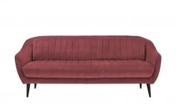 Retro und dennoch modern – das ist das Sofa Sophia. Passend zur Formgebung ist Sophia rundherum mit einer Mikrofaser in Velouroptik bezogen. Der Stoff hebt den Retrolook wunderbar hervor. Im Sitz- und Rückenbereich ist er dekorativ gesteppt. Da auch die Rückseite des Dreisitzers mit dem originalen Stoff bezogen ist, kann die Couch gerne mittig im Raum stehen. Spitze schwarze Füßchen aus massivem Buchenholz sorgen für einen soliden Stand. Sophia ist mit einem komfortablen und formstabilen Polyätherschaum bezogen. Im Sitzbereich gibt es zusätzliche Gummigurte, die für eine noch bessere Abfederung sorgen.