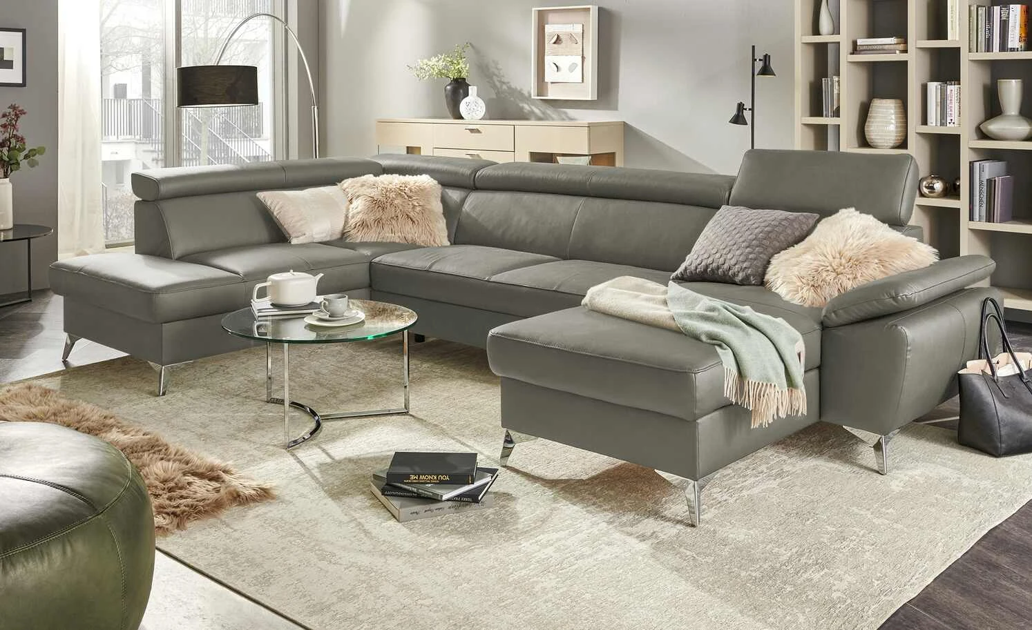 Modern, edel und perfekt für gemütliche Stunden: Die Wohnlandschaft Apollo bietet viel Platz bei höchstem Komfort. Die Sitz- und Rückenfront der Wohnlandschaft ist mit hochwertigem Echtleder bezogen, für den Korpus wurde pflegeleichtes Kunstleder verwendet. Der Bezug besitzt dezente Nähte in der gleichen Farbe wie das Sofa. Machen Sie es sich bequem und verstellen Sie ganz einfach die Armlehne und die Kopfteile. Die hochwertige Kaltschaumpolsterung und Wellenunterfederung sorgen für langanhaltenden Sitzkomfort. Angewinkelte Metallfüße in Chrom-Optik veredeln das Erscheinungsbild der Wohnlandschaft. Apollo kann problemlos mit den meisten Einrichtungsstilen kombiniert werden.