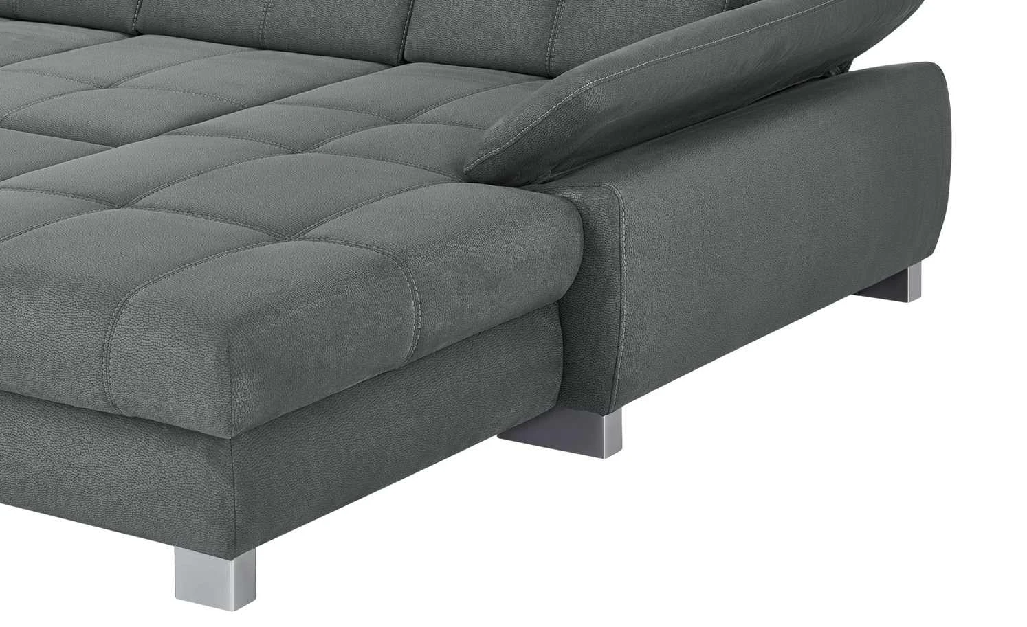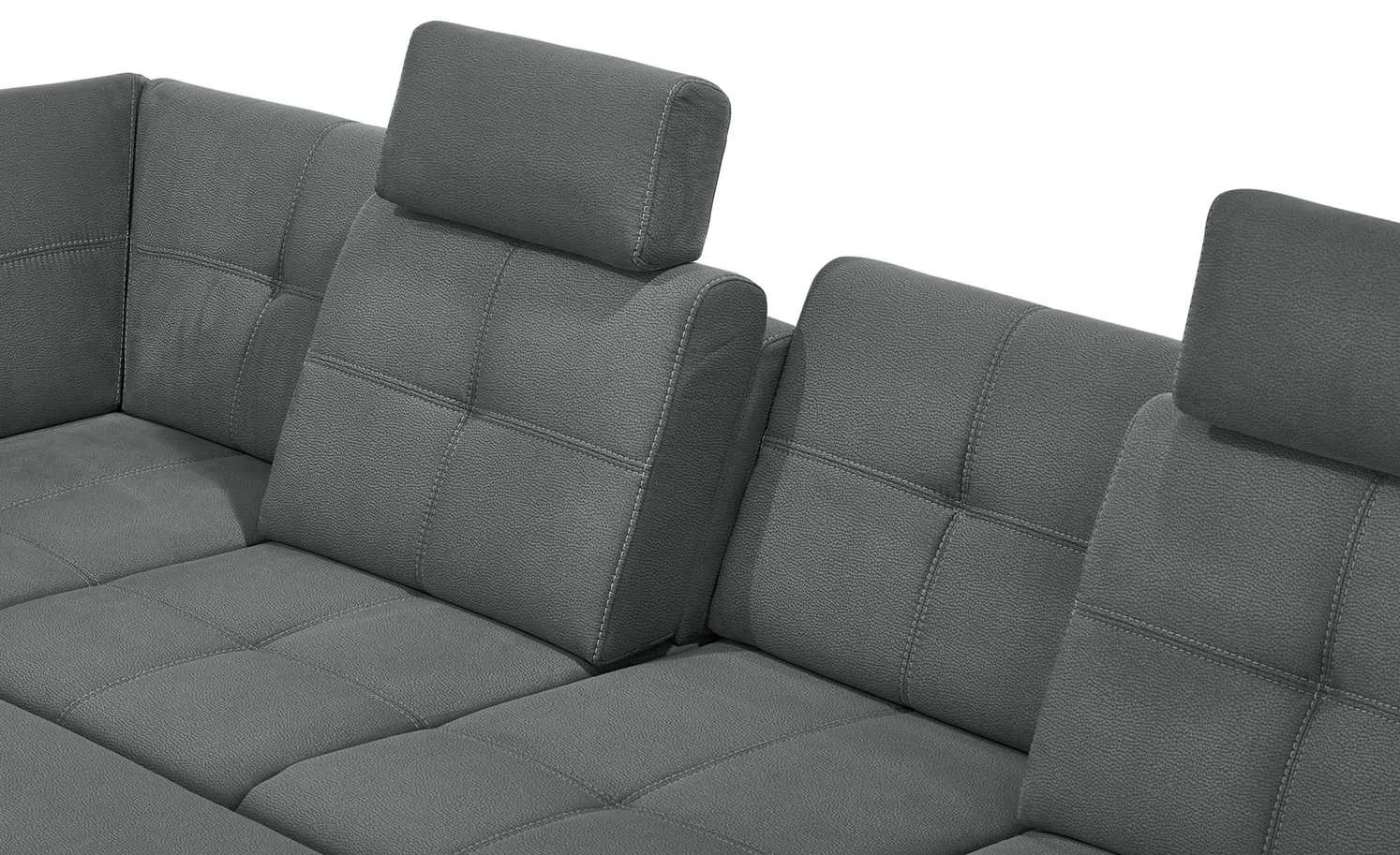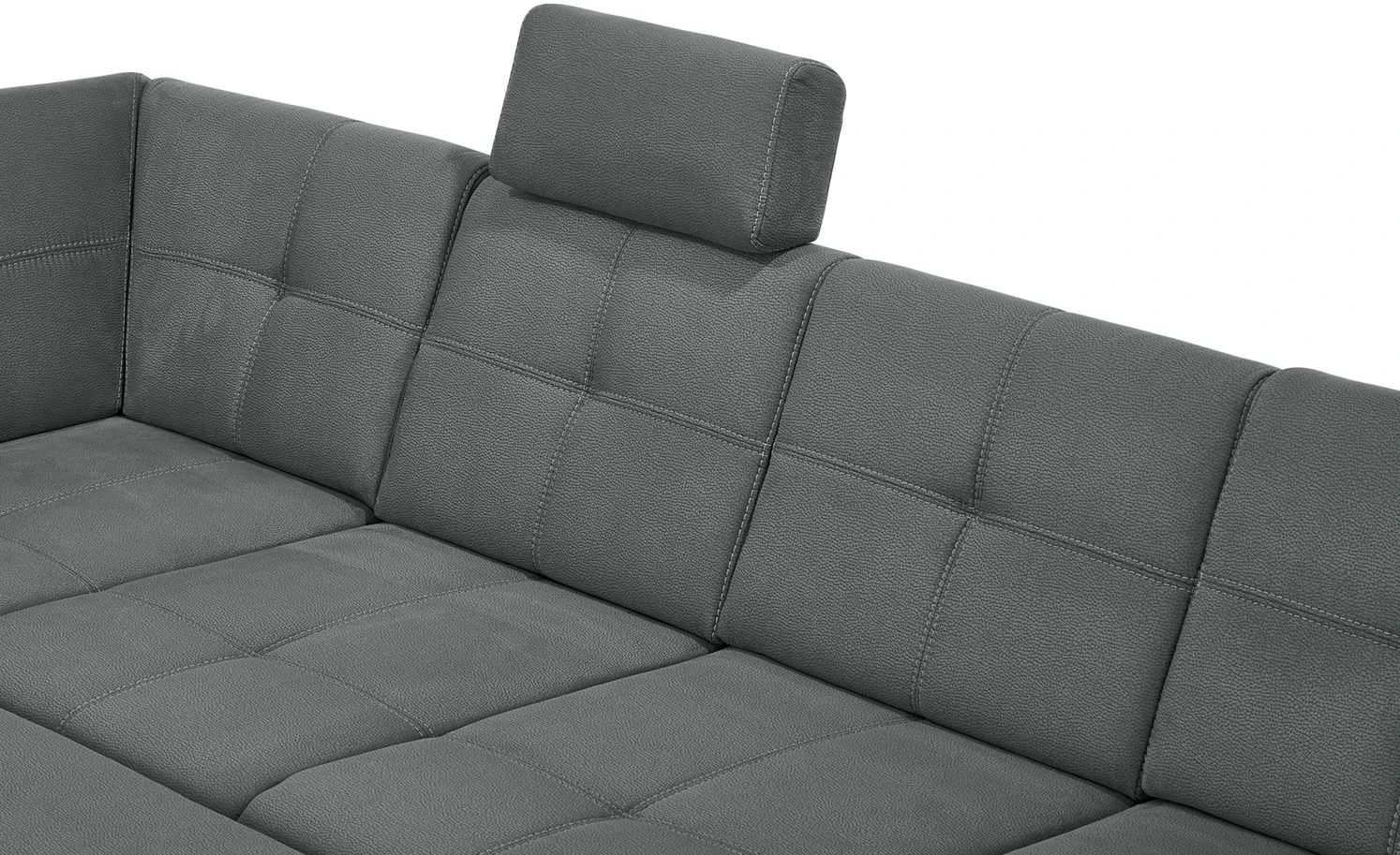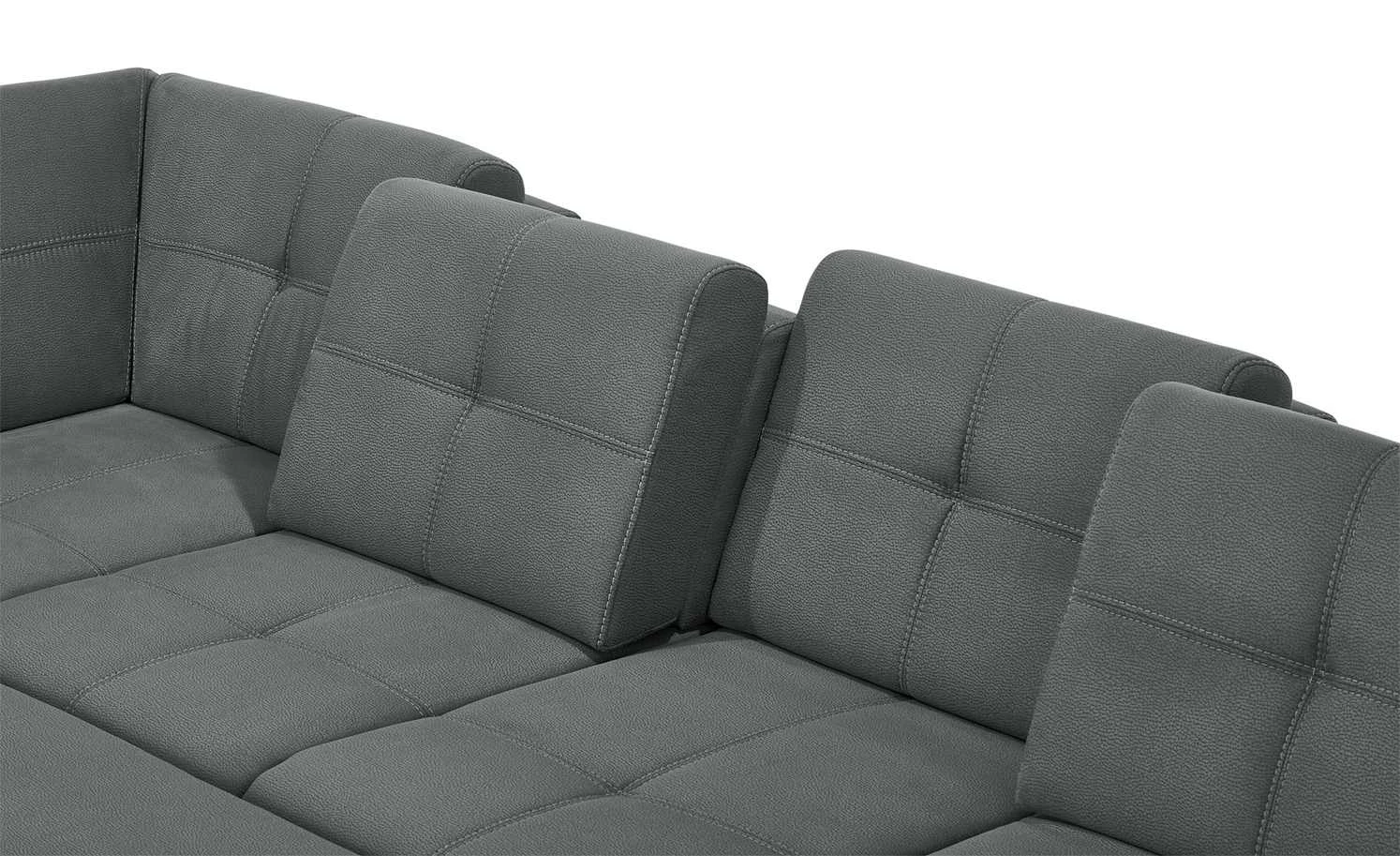 Für große Familien empfehlen sich Wohnlandschaften. Sie sind U-förmig designt und bieten somit eine extra großzügige Sitzfläche. So wie die Wohnlandschaft Cosima. Sie ist komfortabel gepolstert und verfügt zusätzlich über eine Nosag-Wellenunterfederung im Sitzbereich. Drei Sitze sind mit einer Sitztiefenverstellung ausgestattet. Dabei können Sie die Tiefe der Sitze zwischen 55 und 72 cm variieren. Auch die Armlehne kann in ihrer Position verstellt werden. Cosima kann mit wenigen Handgriffen zum Gästebett ausgezogen werden. Unterhalb der Sitzfläche befinden sich ein großer und ein kleiner Bettkasten. Für den Bezug ist eine weiche Mikrofaser in Lederoptik verwendet worden. Sie ist im Sitz- und Rückenbereich dekorativ gesteppt.