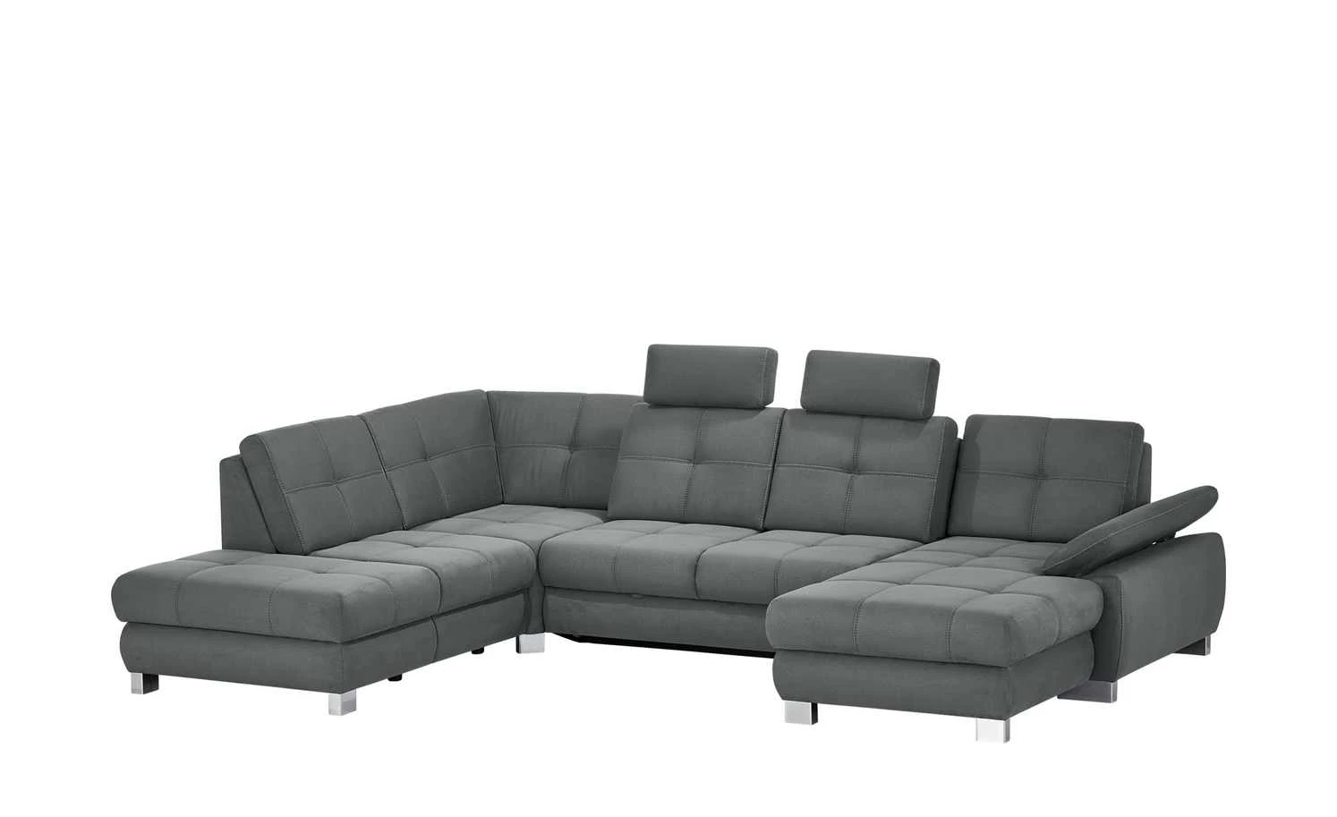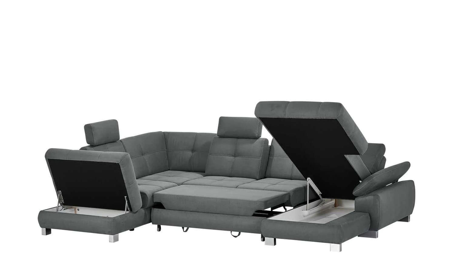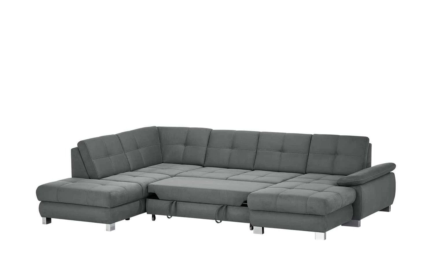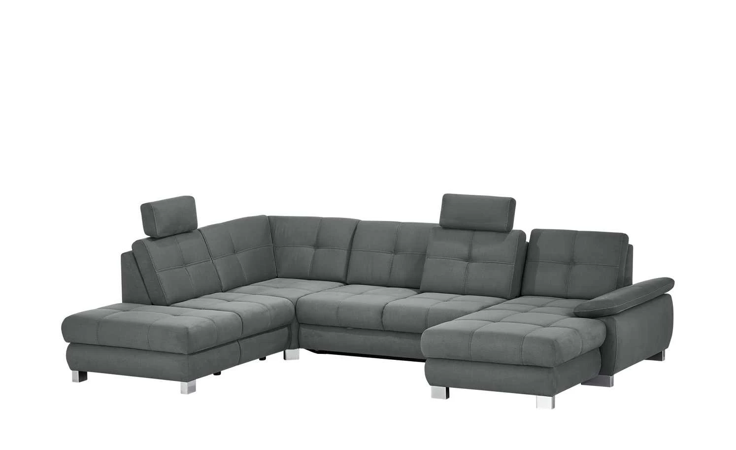 Für große Familien empfehlen sich Wohnlandschaften. Sie sind U-förmig designt und bieten somit eine extra großzügige Sitzfläche. So wie die Wohnlandschaft Cosima. Sie ist komfortabel gepolstert und verfügt zusätzlich über eine Nosag-Wellenunterfederung im Sitzbereich. Drei Sitze sind mit einer Sitztiefenverstellung ausgestattet. Dabei können Sie die Tiefe der Sitze zwischen 55 und 72 cm variieren. Auch die Armlehne kann in ihrer Position verstellt werden. Cosima kann mit wenigen Handgriffen zum Gästebett ausgezogen werden. Unterhalb der Sitzfläche befinden sich ein großer und ein kleiner Bettkasten. Für den Bezug ist eine weiche Mikrofaser in Lederoptik verwendet worden. Sie ist im Sitz- und Rückenbereich dekorativ gesteppt.
